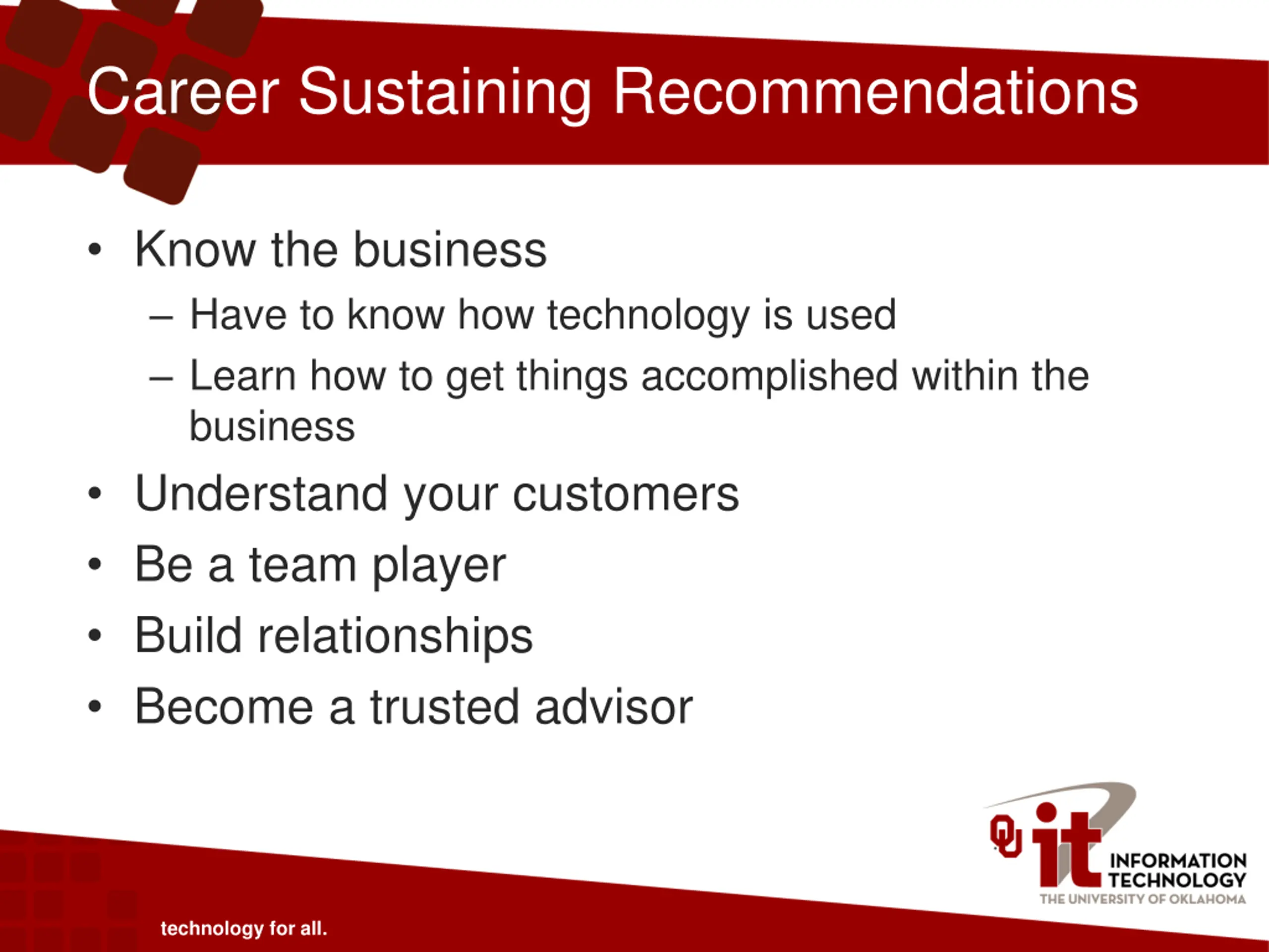 Career Sustaining Recommendations Know the business Have to know how technology is used Learn how to get things accomplished within the business Understand your customers Be a team player Build relationships Become a trusted advisor technology for all.