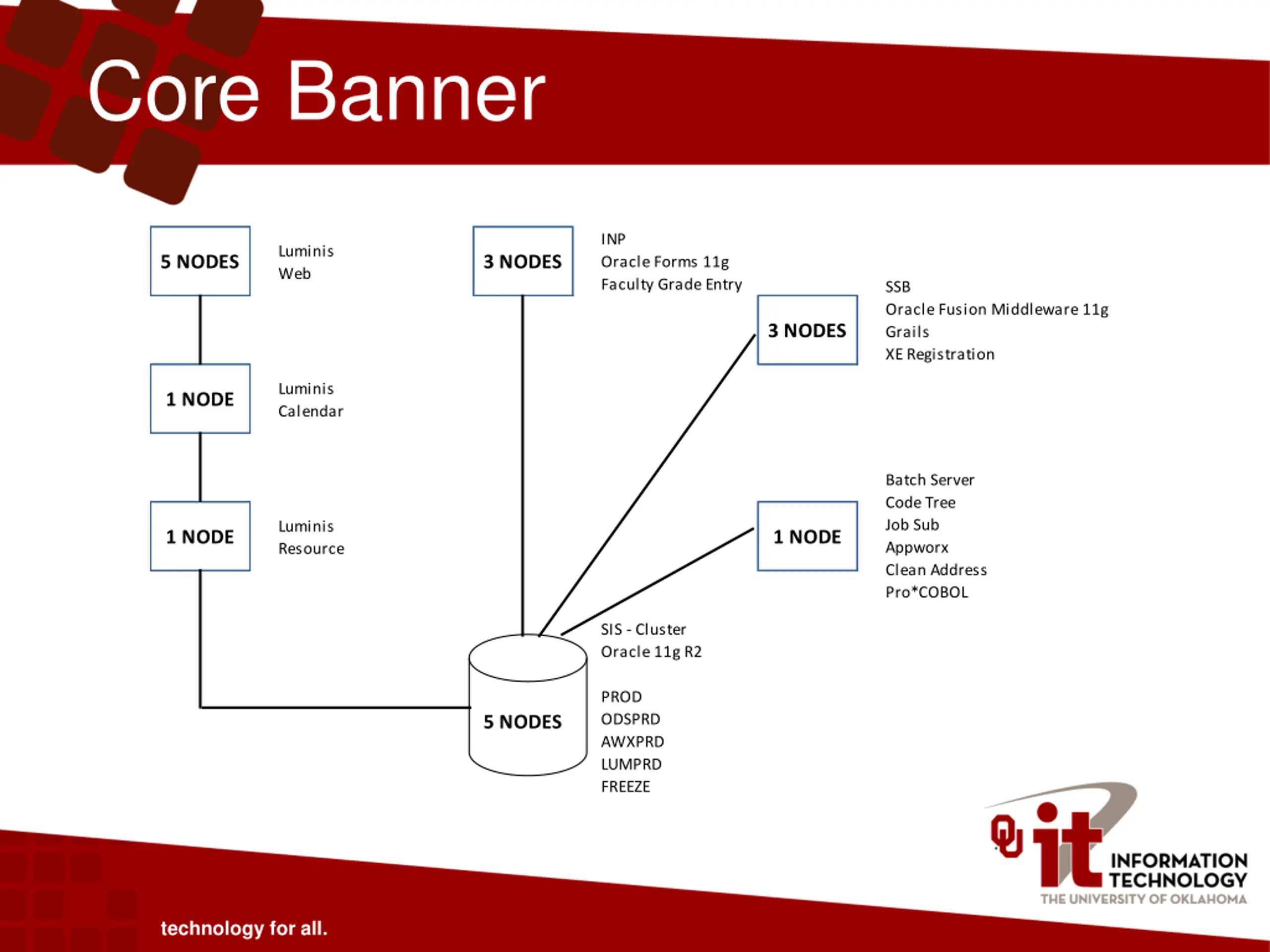 Core Banner INP Oracle Forms 11g Faculty Grade Entry Luminis Web 5 NODES 3 NODES SSB Oracle Fusion Middleware 11g Grails XE Registration 3 NODES Luminis Calendar 1 NODE Batch Server Code Tree Job Sub Appworx Clean Address Pro*COBOL Luminis Resource 1 NODE 1 NODE SIS - Cluster Oracle 11g R2 PROD ODSPRD AWXPRD LUMPRD FREEZE 5 NODES technology for all.