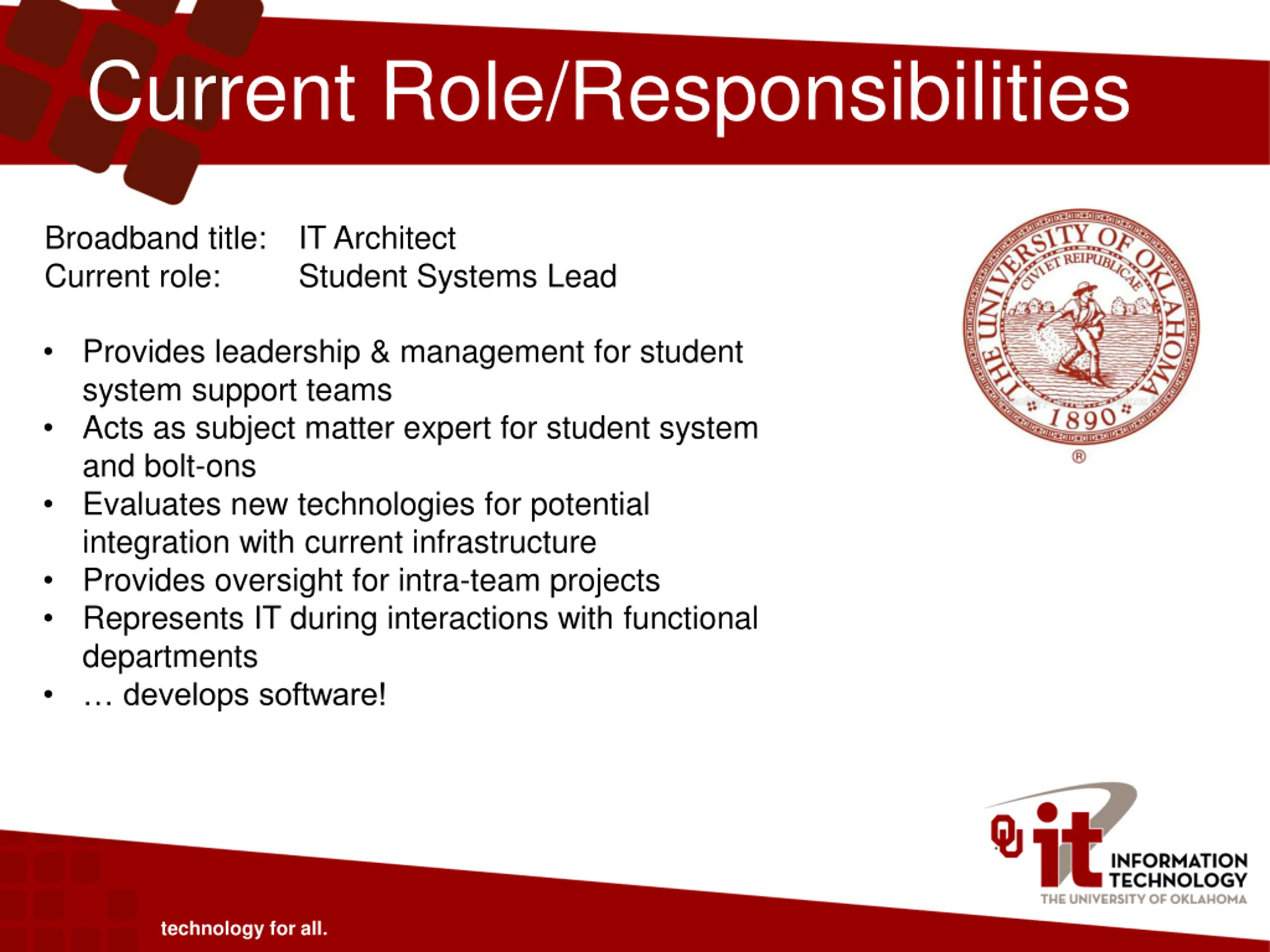 Current Role/Responsibilities Broadband title: IT Architect Current role: Student Systems Lead Provides leadership & management for student system support teams Acts as subject matter expert for student system and bolt-ons Evaluates new technologies for potential integration with current infrastructure Provides oversight for intra-team projects Represents IT during interactions with functional departments develops software! technology for all.