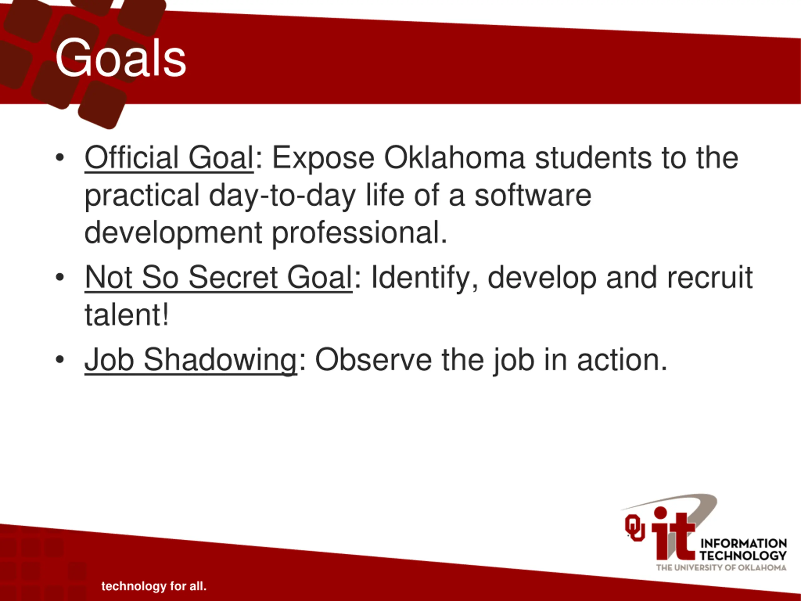 Goals Official Goal: Expose Oklahoma students to the practical day-to-day life of a software development professional. Not So Secret Goal: Identify, develop and recruit talent! Job Shadowing: Observe the job in action. technology for all.