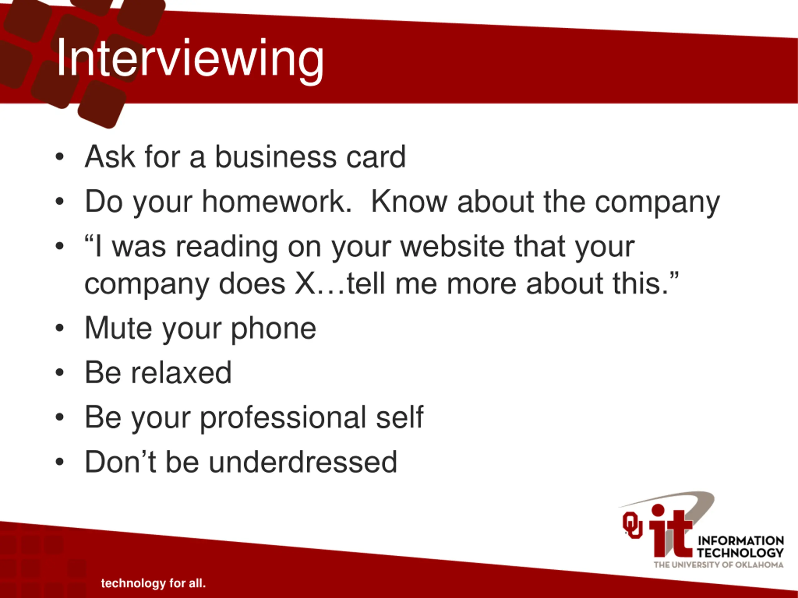 Interviewing Ask for a business card Do your homework. Know about the company I was reading on your website that your company does X tell me more about this. Mute your phone Be relaxed Be your professional self Don t be underdressed technology for all.