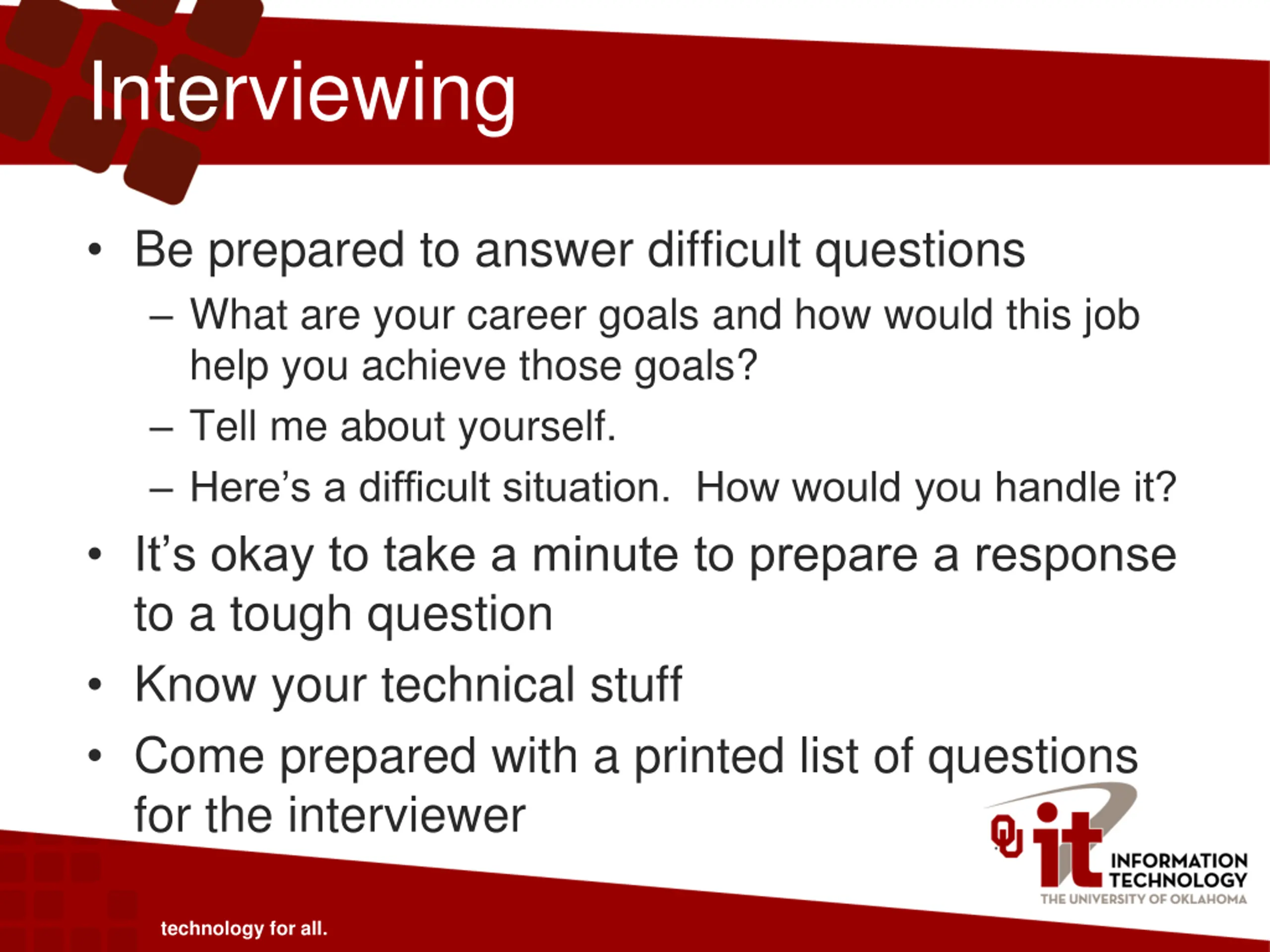 Interviewing Be prepared to answer difficult questions What are your career goals and how would this job help you achieve those goals? Tell me about yourself. Here s a difficult situation. How would you handle it? It s okay to take a minute to prepare a response to a tough question Know your technical stuff Come prepared with a printed list of questions for the interviewer technology for all.
