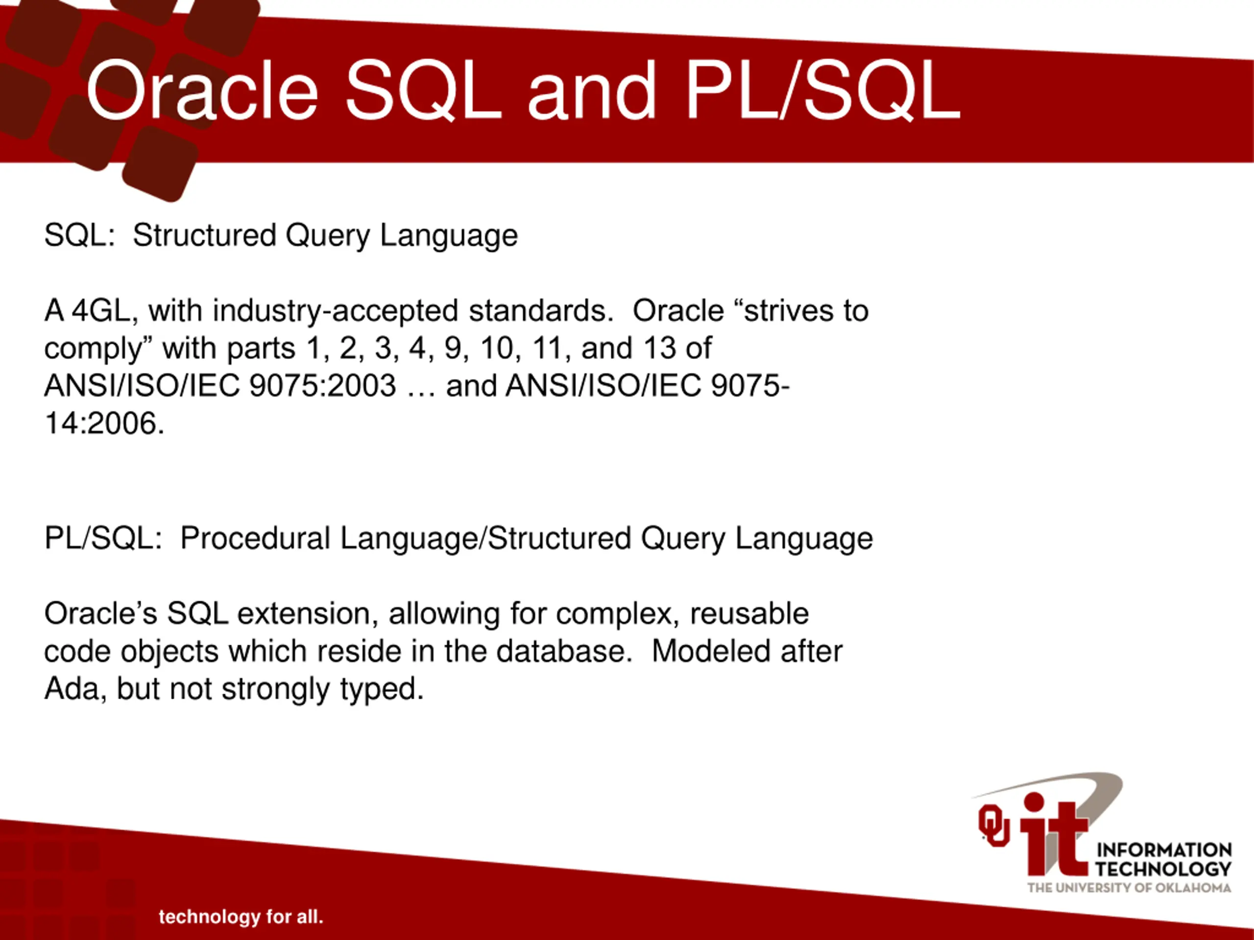 Oracle SQL and PL/SQL SQL: Structured Query Language A 4GL, with industry-accepted standards. Oracle strives to comply with parts 1, 2, 3, 4, 9, 10, 11, and 13 of ANSI/ISO/IEC 9075:2003 and ANSI/ISO/IEC 9075- 14:2006. PL/SQL: Procedural Language/Structured Query Language Oracle s SQL extension, allowing for complex, reusable code objects which reside in the database. Modeled after Ada, but not strongly typed. technology for all.