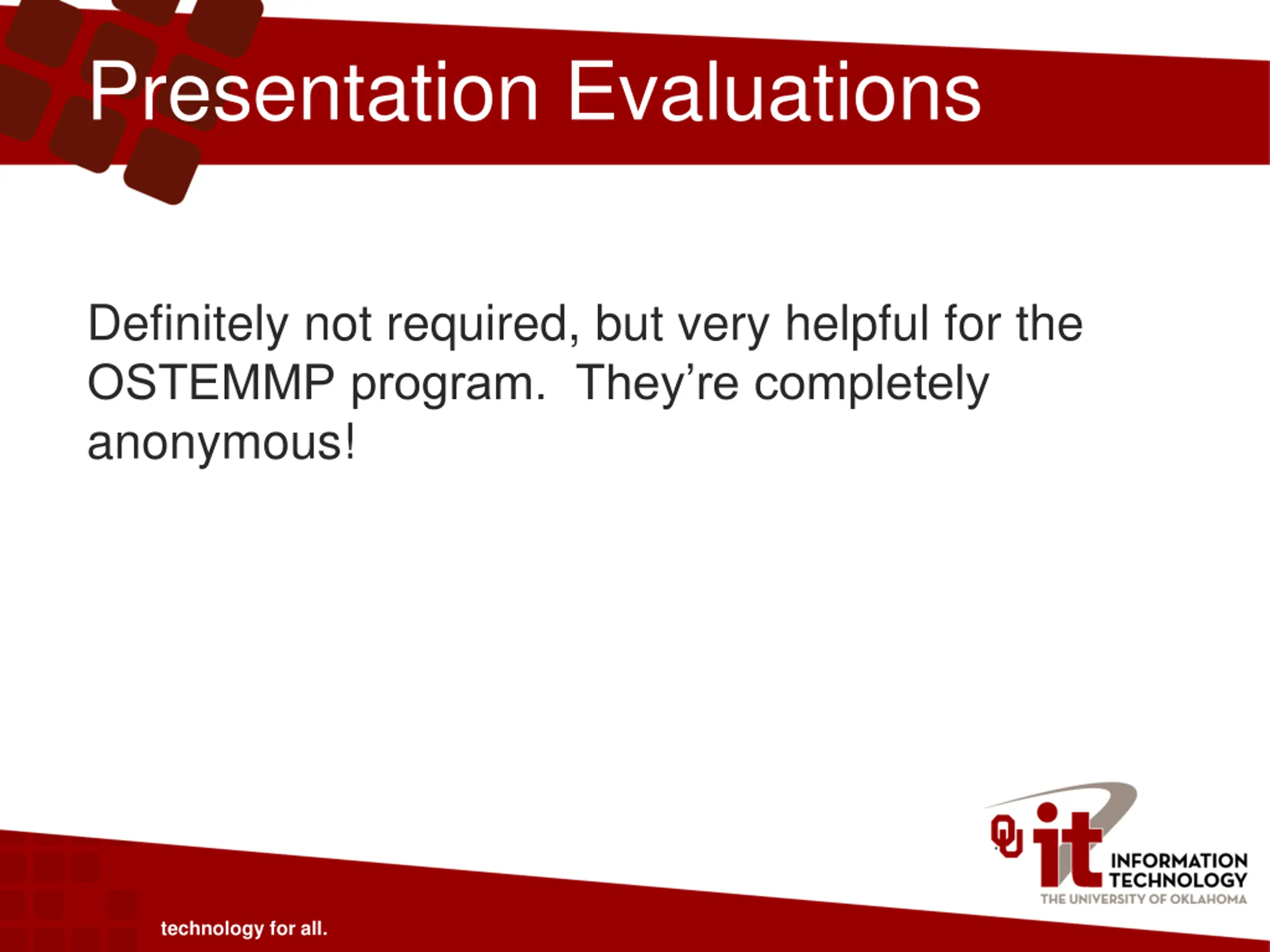 Presentation Evaluations Definitely not required, but very helpful for the OSTEMMP program. They re completely anonymous! technology for all.