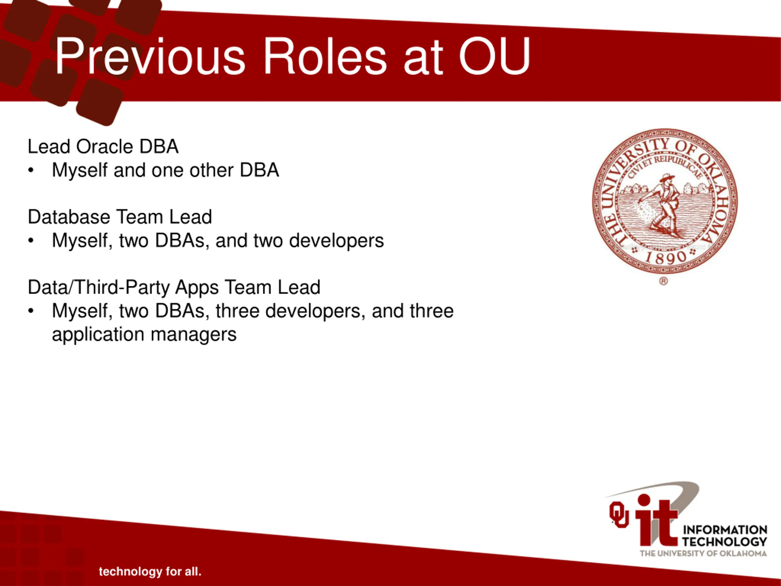 Previous Roles at OU Lead Oracle DBA Myself and one other DBA Database Team Lead Myself, two DBAs, and two developers Data/Third-Party Apps Team Lead Myself, two DBAs, three developers, and three application managers technology for all.