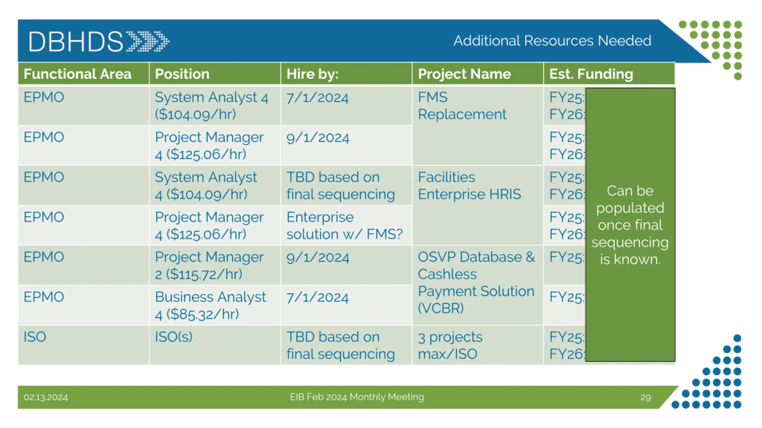 Additional Resources Needed Functional Area EPMO Position System Analyst 4 ($104.09/hr) Project Manager 4 ($125.06/hr) System Analyst 4 ($104.09/hr) Project Manager 4 ($125.06/hr) Project Manager 2 ($115.72/hr) Business Analyst 4 ($85.32/hr) ISO(s) Hire by: 7/1/2024 Project Name FMS Replacement Est. Funding FY25: FY26: FY25: FY26: FY25: FY26: FY25: FY26: FY25: EPMO 9/1/2024 EPMO TBD based on final sequencing Enterprise solution w/ FMS? 9/1/2024 Facilities Enterprise HRIS Can be populated once final sequencing is known. EPMO EPMO OSVP Database & Cashless Payment Solution (VCBR) EPMO 7/1/2024 FY25: ISO TBD based on final sequencing 3 projects max/ISO FY25: FY26: 02.13.2024 EIB Feb 2024 Monthly Meeting 29