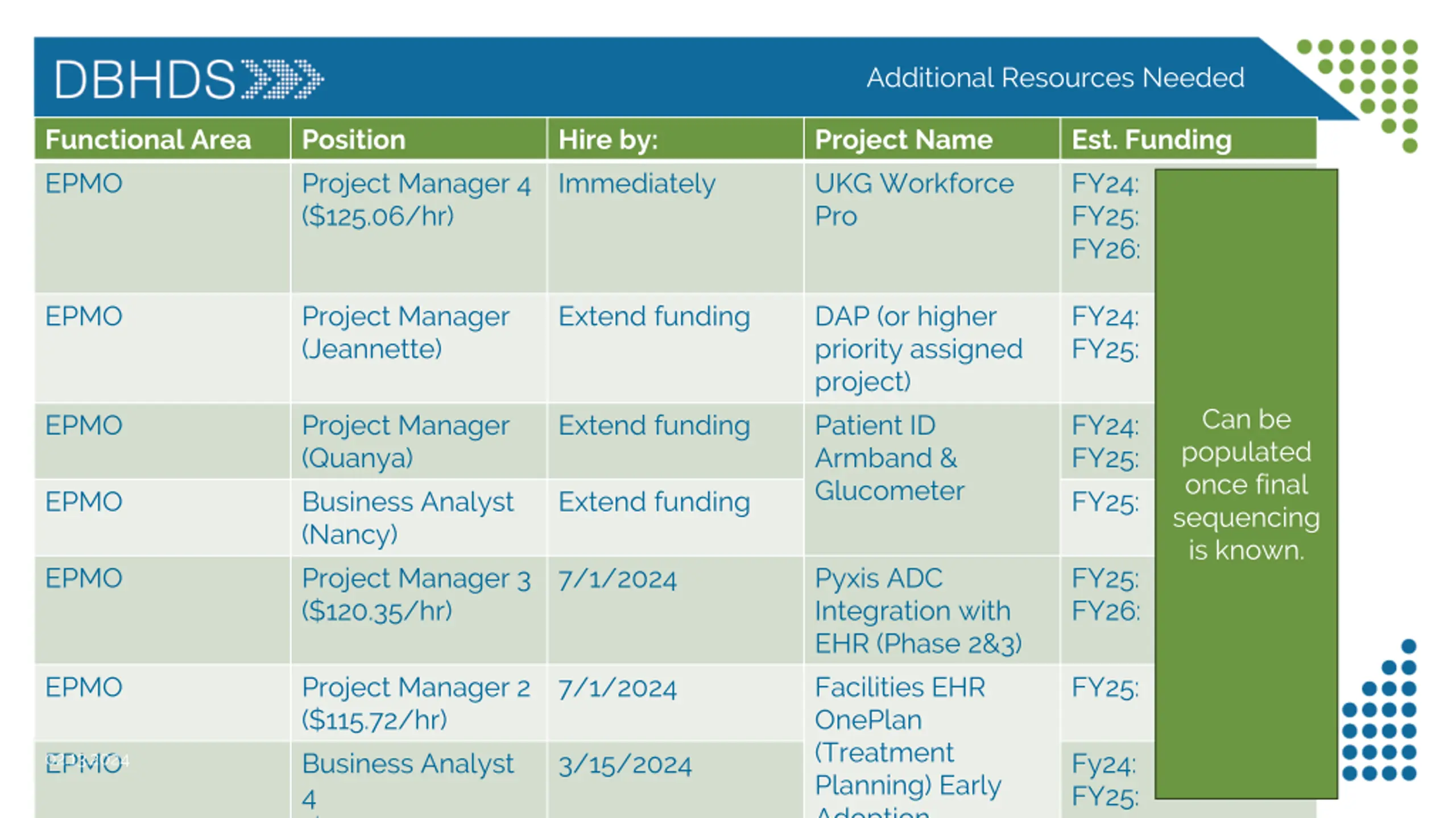 Additional Resources Needed Functional Area EPMO Position Project Manager 4 ($125.06/hr) Hire by: Immediately Project Name UKG Workforce Pro Est. Funding FY24: FY25: FY26: EPMO Project Manager (Jeannette) Extend funding DAP (or higher priority assigned project) Patient ID Armband & Glucometer FY24: FY25: Can be populated once final sequencing is known. EPMO Project Manager (Quanya) Business Analyst (Nancy) Project Manager 3 ($120.35/hr) Extend funding FY24: FY25: FY25: EPMO Extend funding EPMO 7/1/2024 Pyxis ADC Integration with EHR (Phase 2&3) Facilities EHR OnePlan (Treatment Planning) Early Adoption FY25: FY26: EPMO Project Manager 2 ($115.72/hr) Business Analyst 4 ($85.32/hr) 7/1/2024 FY25: EPMO 3/15/2024 Fy24: FY25: 02.13.2024 27