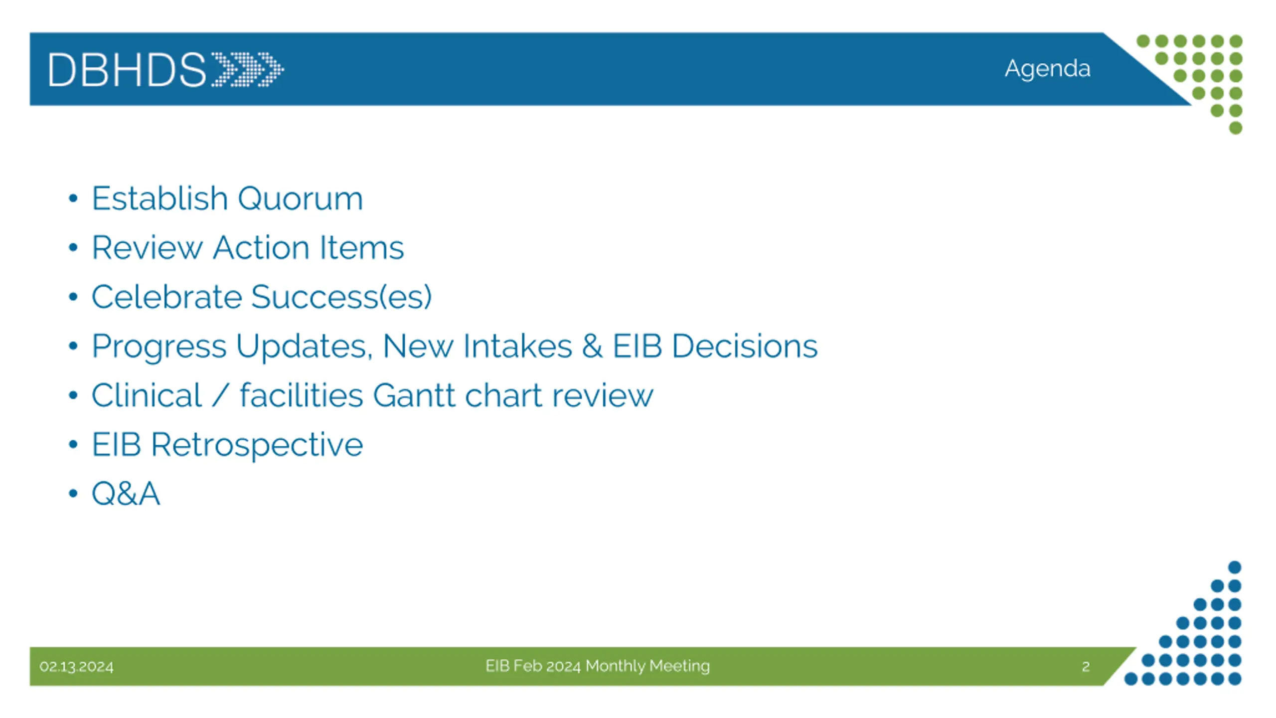 Agenda Establish Quorum Review Action Items Celebrate Success(es) Progress Updates, New Intakes & EIB Decisions Clinical / facilities Gantt chart review EIB Retrospective Q&A 02.13.2024 EIB Feb 2024 Monthly Meeting 2