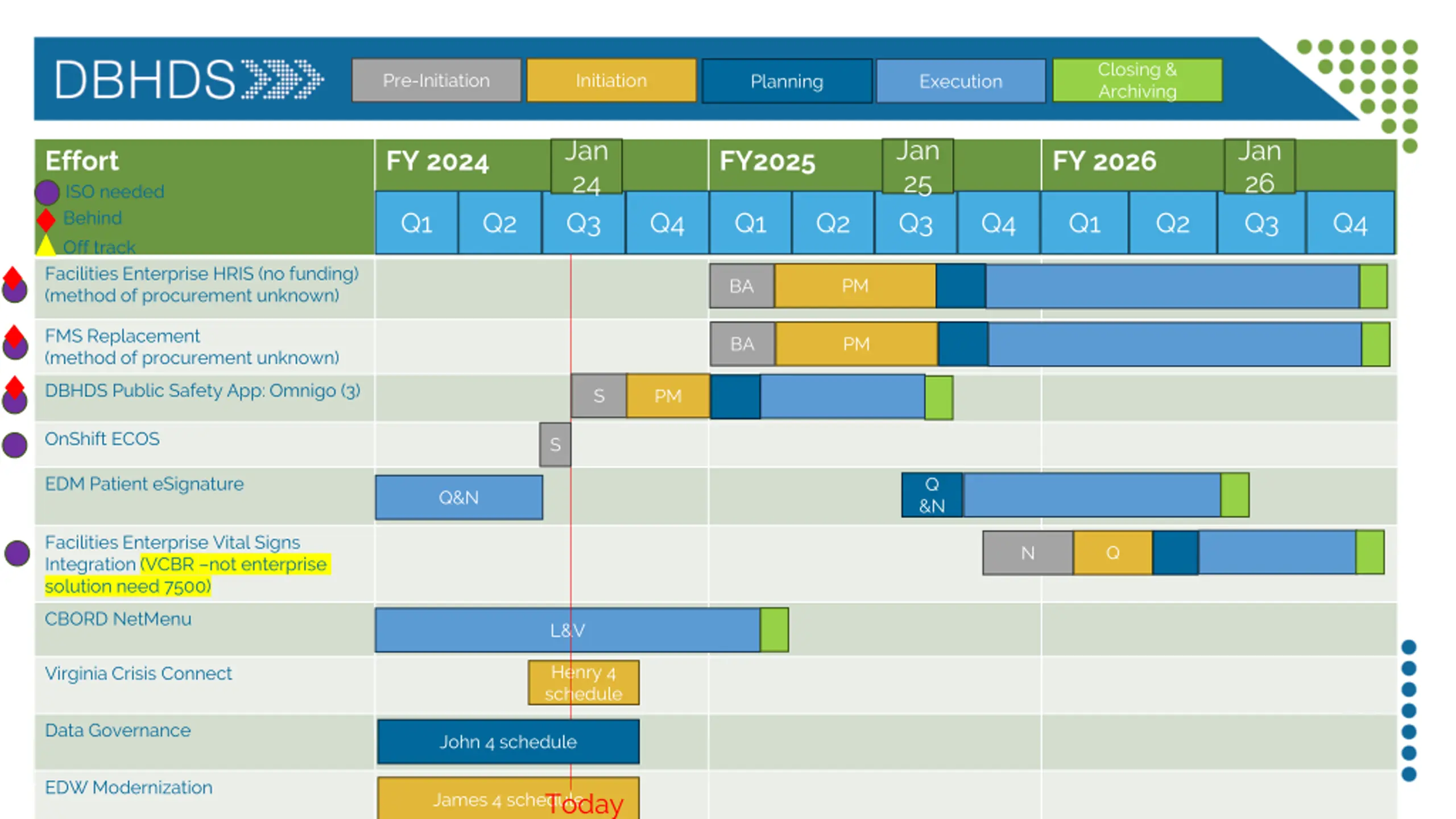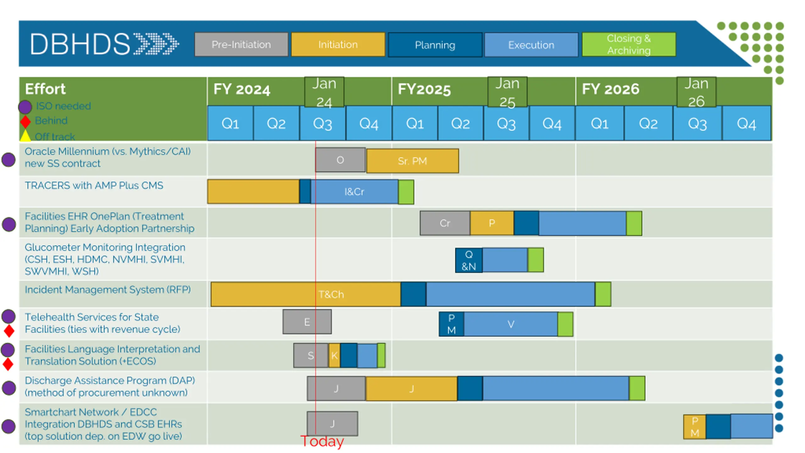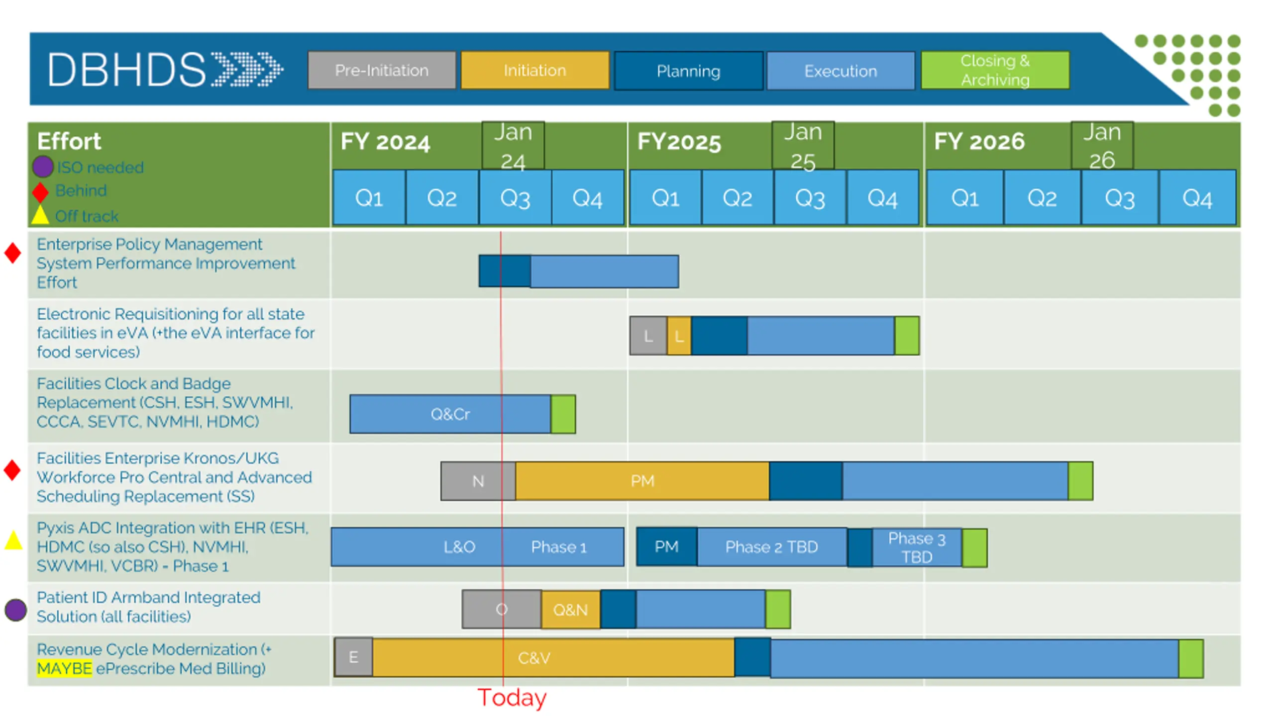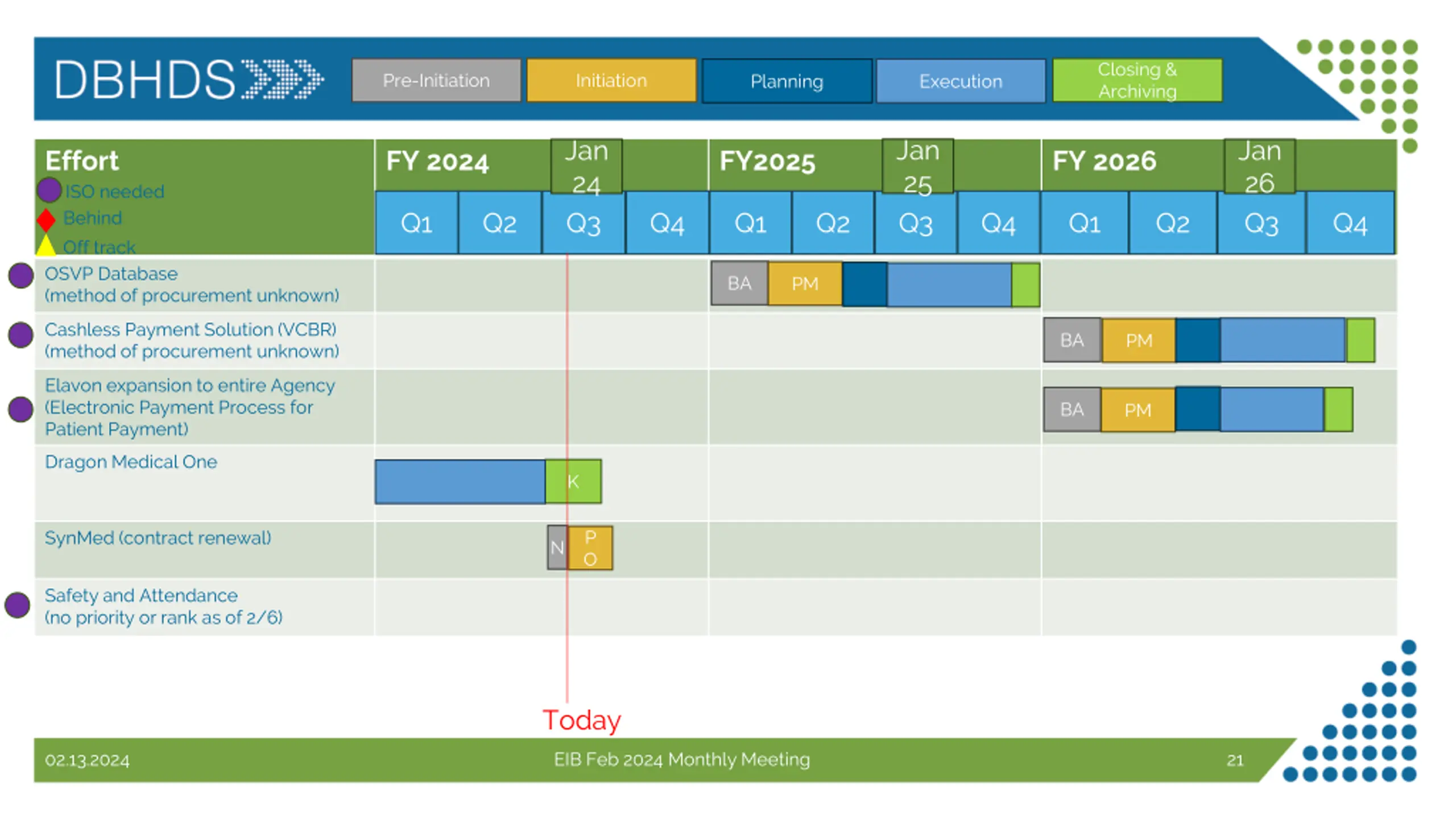 Closing & Archiving Pre-Initiation Initiation Planning Execution Jan 25 Jan 24 Jan 26 Effort ISO needed Behind Off track FY 2024 FY2025 FY 2026 Q1 Q2 Q3 Q4 Q1 Q2 Q3 Q4 Q1 Q2 Q3 Q4 Facilities Enterprise HRIS (no funding) (method of procurement unknown) PM BA FMS Replacement (method of procurement unknown) BA PM DBHDS Public Safety App: Omnigo (3) S PM OnShift ECOS S EDM Patient eSignature Q &N Q&N Facilities Enterprise Vital Signs Integration (VCBR not enterprise solution need 7500) Q N CBORD NetMenu L&V Henry 4 schedule Virginia Crisis Connect Data Governance John 4 schedule 02.13.2024 EDW Modernization EIB Feb 2024 Monthly Meeting 20 Today James 4 schedule