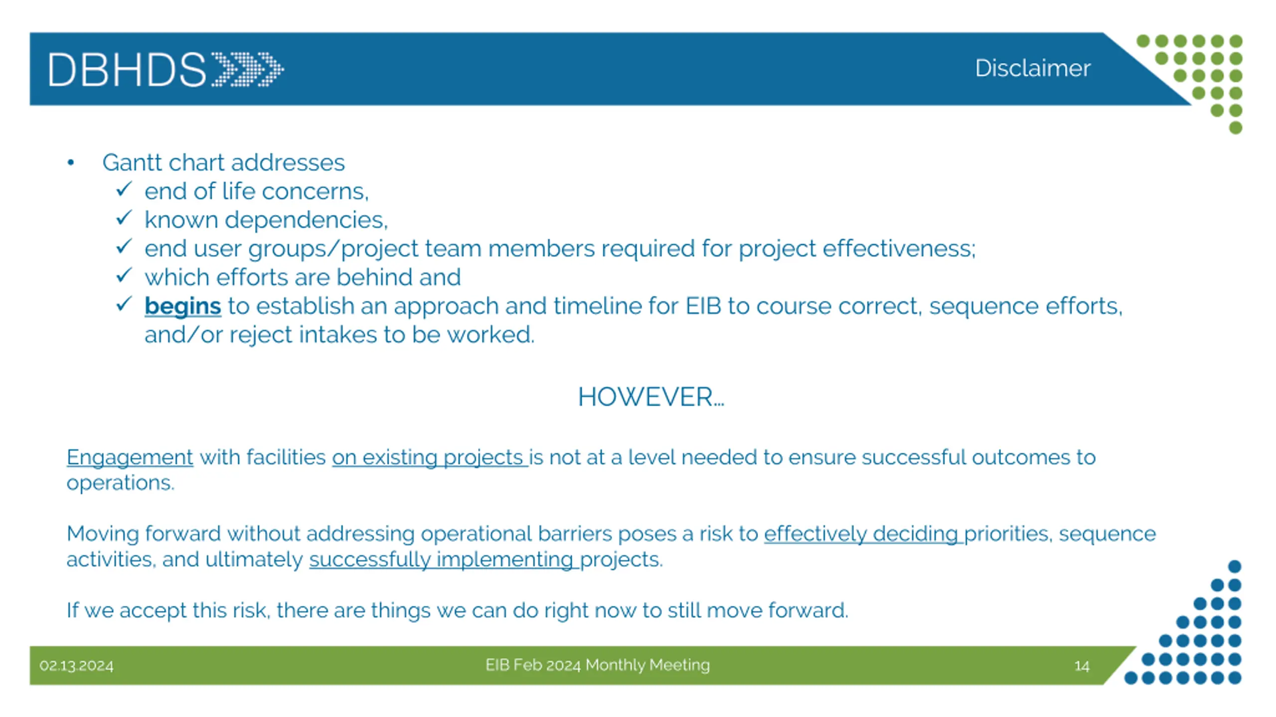 Disclaimer Gantt chart addresses end of life concerns, known dependencies, end user groups/project team members required for project effectiveness; which efforts are behind and begins to establish an approach and timeline for EIB to course correct, sequence efforts, and/or reject intakes to be worked. HOWEVER Engagement with facilities on existing projects is not at a level needed to ensure successful outcomes to operations. Moving forward without addressing operational barriers poses a risk to effectively deciding priorities, sequence activities, and ultimately successfully implementing projects. If we accept this risk, there are things we can do right now to still move forward. 02.13.2024 EIB Feb 2024 Monthly Meeting 14