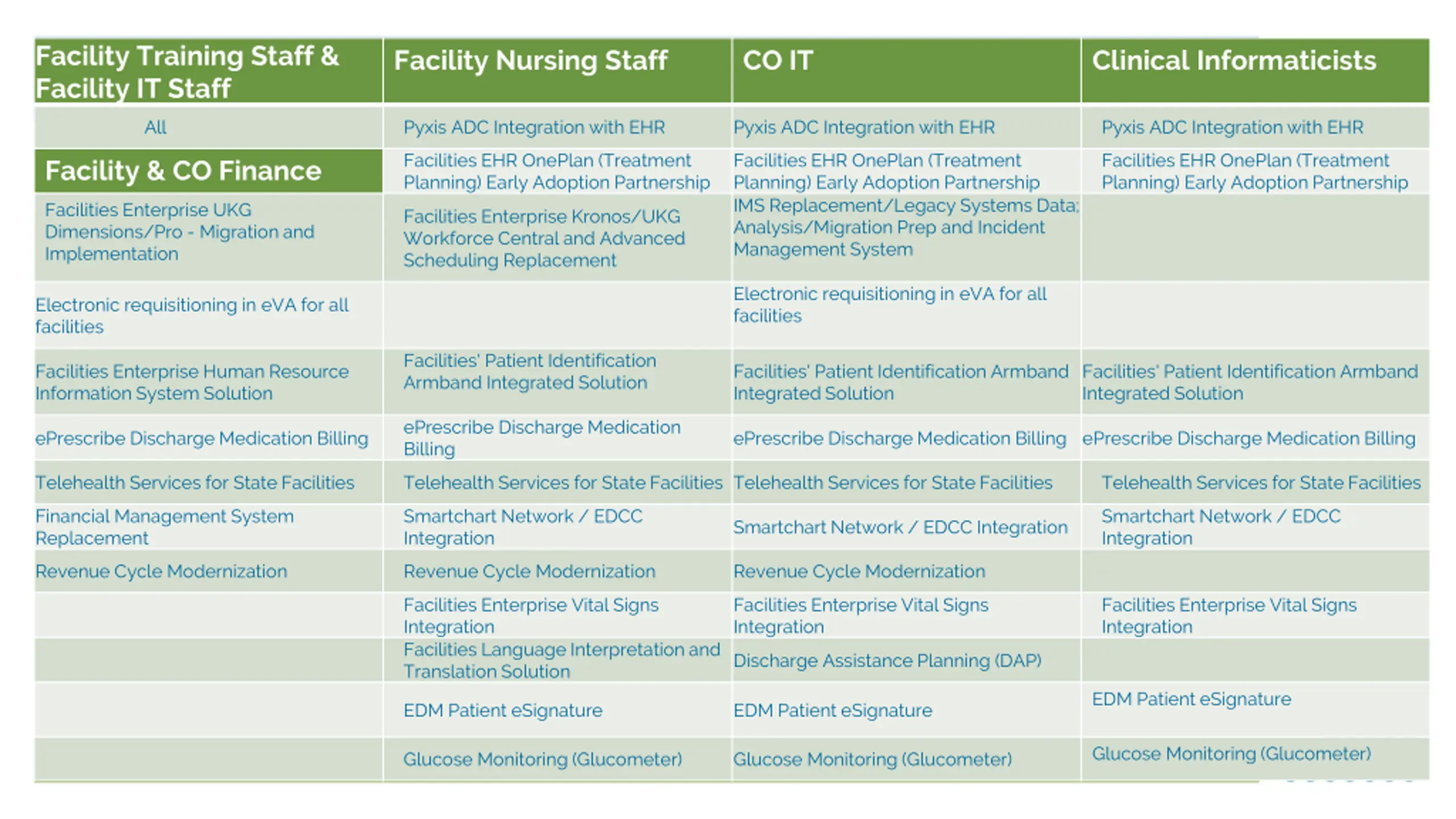 Facility Training Staff & Facility IT Staff Facility Nursing Staff CO IT Clinical Informaticists All Pyxis ADC Integration with EHR Pyxis ADC Integration with EHR Pyxis ADC Integration with EHR Facilities EHR OnePlan (Treatment Planning) Early Adoption Partnership Facilities EHR OnePlan (Treatment Planning) Early Adoption Partnership IMS Replacement/Legacy Systems Data; Analysis/Migration Prep and Incident Management System Facilities EHR OnePlan (Treatment Planning) Early Adoption Partnership Facility & CO Finance Facilities Enterprise UKG Dimensions/Pro - Migration and Implementation Facilities Enterprise Kronos/UKG Workforce Central and Advanced Scheduling Replacement Electronic requisitioning in eVA for all facilities Electronic requisitioning in eVA for all facilities Facilities' Patient Identification Armband Integrated Solution Facilities Enterprise Human Resource Information System Solution Facilities' Patient Identification Armband Integrated Solution Facilities' Patient Identification Armband Integrated Solution ePrescribe Discharge Medication Billing ePrescribe Discharge Medication Billing ePrescribe Discharge Medication Billing ePrescribe Discharge Medication Billing Telehealth Services for State Facilities Telehealth Services for State Facilities Telehealth Services for State Facilities Telehealth Services for State Facilities Financial Management System Replacement Smartchart Network / EDCC Integration Smartchart Network / EDCC Integration Smartchart Network / EDCC Integration Revenue Cycle Modernization Revenue Cycle Modernization Revenue Cycle Modernization Facilities Enterprise Vital Signs Integration Facilities Language Interpretation and Translation Solution Facilities Enterprise Vital Signs Integration Facilities Enterprise Vital Signs Integration Discharge Assistance Planning (DAP) EDM Patient eSignature EDM Patient eSignature EDM Patient eSignature Glucose Monitoring (Glucometer) 01.09.2024 EIB Jan 2024 Monthly Meeting 26 Glucose Monitoring (Glucometer) Glucose Monitoring (Glucometer)