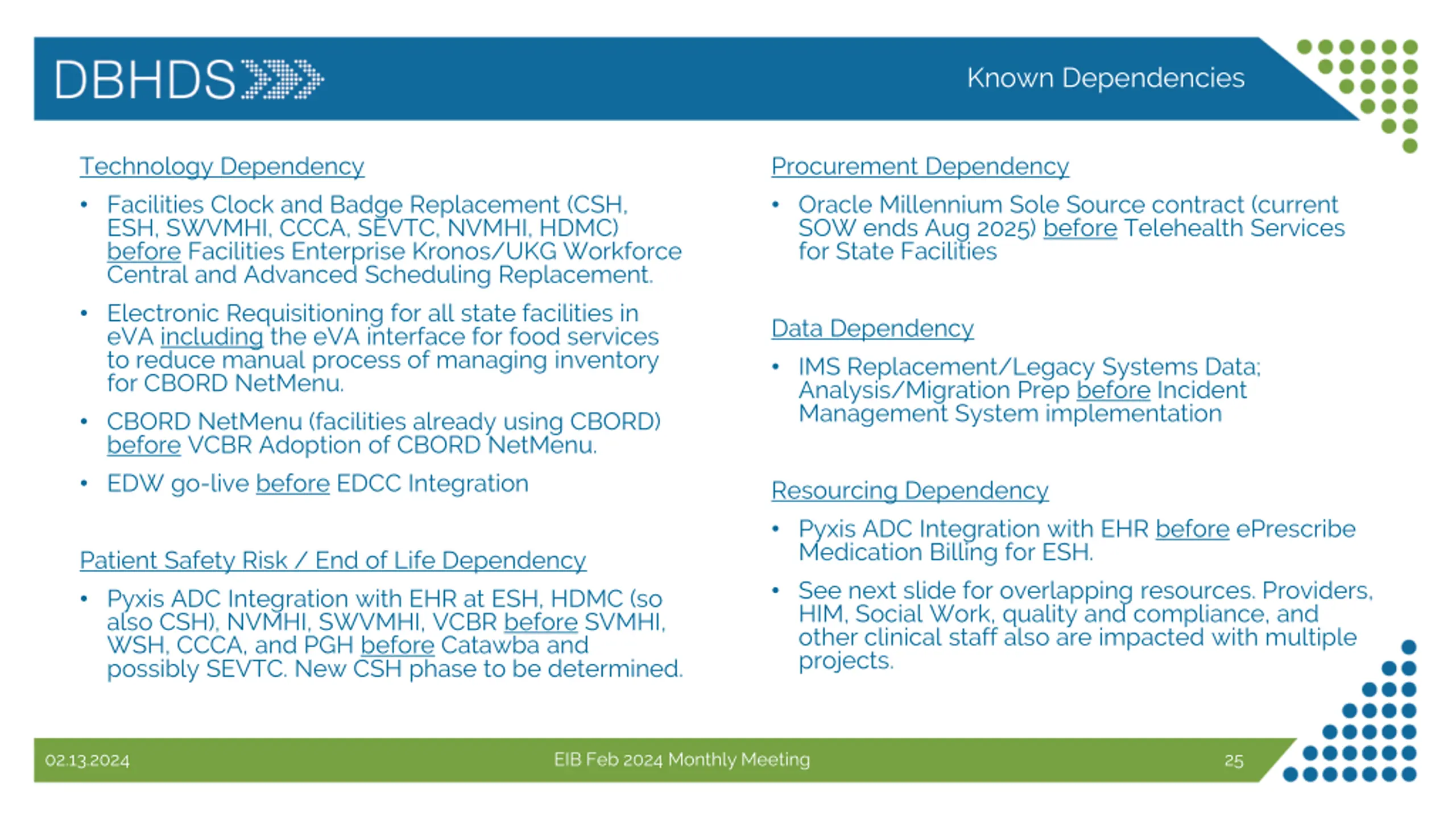 Known Dependencies Technology Dependency Facilities Clock and Badge Replacement (CSH, ESH, SWVMHI, CCCA, SEVTC, NVMHI, HDMC) before Facilities Enterprise Kronos/UKG Workforce Central and Advanced Scheduling Replacement. Electronic Requisitioning for all state facilities in eVA including the eVA interface for food services to reduce manual process of managing inventory for CBORD NetMenu. CBORD NetMenu (facilities already using CBORD) before VCBR Adoption of CBORD NetMenu. EDW go-live before EDCC Integration Procurement Dependency Oracle Millennium Sole Source contract (current SOW ends Aug 2025) before Telehealth Services for State Facilities Data Dependency IMS Replacement/Legacy Systems Data; Analysis/Migration Prep before Incident Management System implementation Resourcing Dependency Pyxis ADC Integration with EHR before ePrescribe Medication Billing for ESH. See next slide for overlapping resources. Providers, HIM, Social Work, quality and compliance, and other clinical staff also are impacted with multiple projects. Patient Safety Risk / End of Life Dependency Pyxis ADC Integration with EHR at ESH, HDMC (so also CSH), NVMHI, SWVMHI, VCBR before SVMHI, WSH, CCCA, and PGH before Catawba and possibly SEVTC. New CSH phase to be determined. 02.13.2024 EIB Feb 2024 Monthly Meeting 25