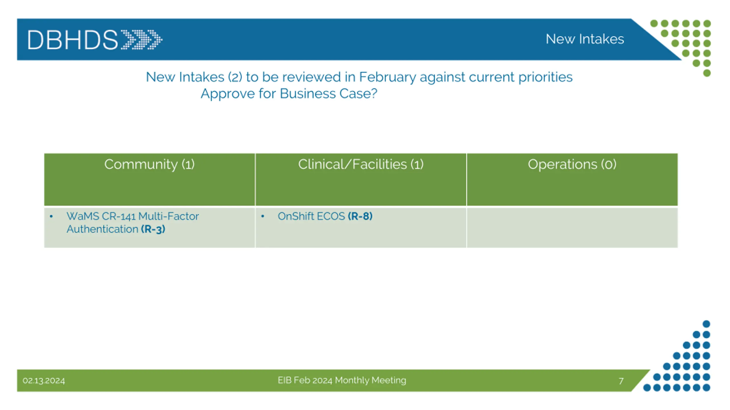 New Intakes New Intakes (2) to be reviewed in February against current priorities Approve for Business Case? Community (1) Clinical/Facilities (1) Operations (0) OnShift ECOS (R-8) WaMS CR-141 Multi-Factor Authentication (R-3) 02.13.2024 EIB Feb 2024 Monthly Meeting 7