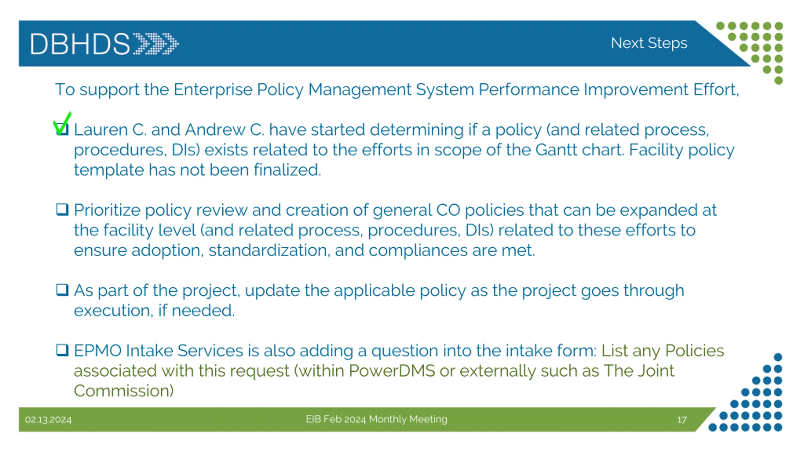 Next Steps To support the Enterprise Policy Management System Performance Improvement Effort, Lauren C. and Andrew C. have started determining if a policy (and related process, procedures, DIs) exists related to the efforts in scope of the Gantt chart. Facility policy template has not been finalized. Prioritize policy review and creation of general CO policies that can be expanded at the facility level (and related process, procedures, DIs) related to these efforts to ensure adoption, standardization, and compliances are met. As part of the project, update the applicable policy as the project goes through execution, if needed. EPMO Intake Services is also adding a question into the intake form: List any Policies associated with this request (within PowerDMS or externally such as The Joint Commission) 02.13.2024 EIB Feb 2024 Monthly Meeting 17