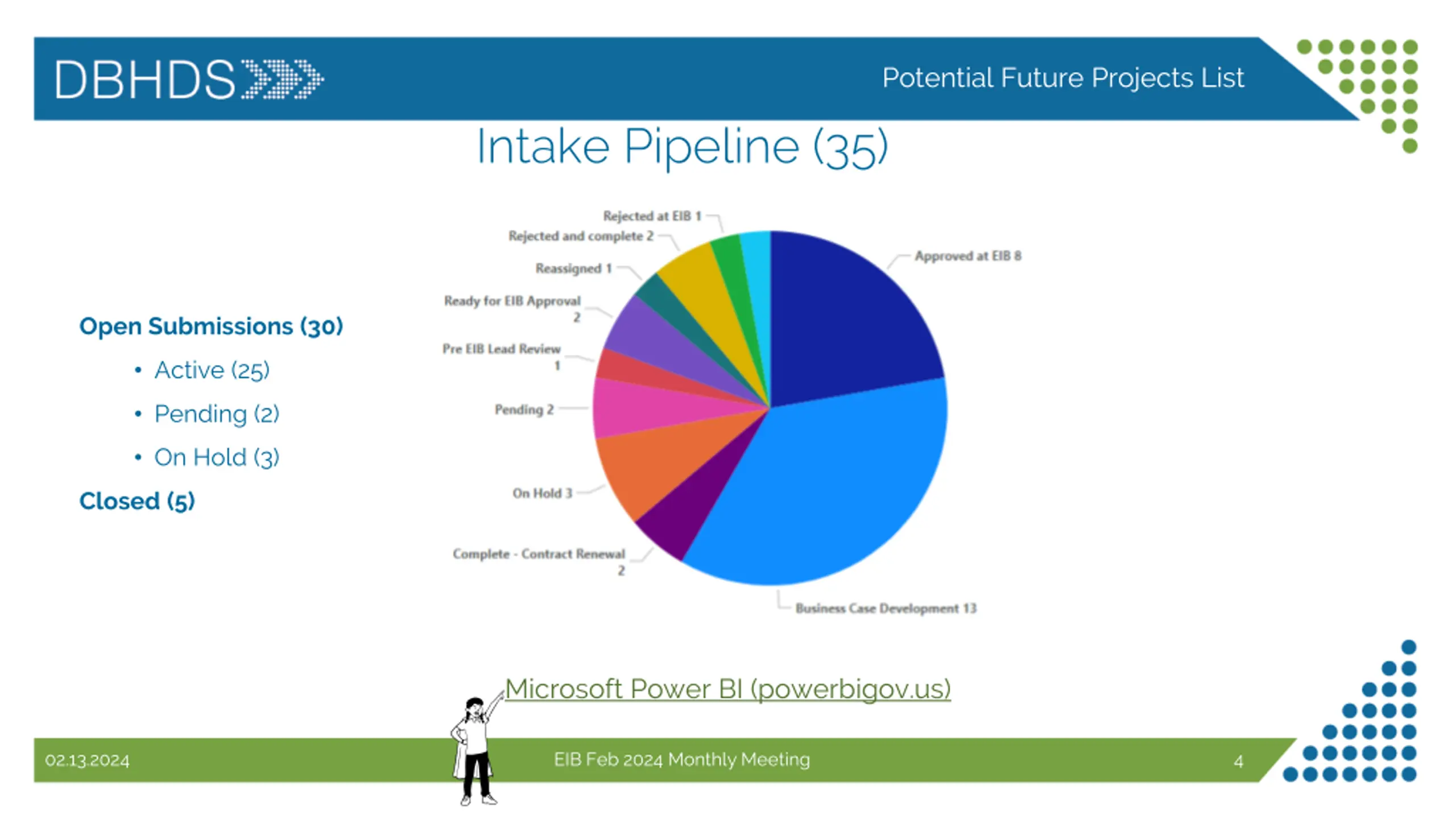 Potential Future Projects List Intake Pipeline (35) Open Submissions (30) Active (25) Pending (2) On Hold (3) Closed (5) Business Case Backlog Microsoft Power BI (powerbigov.us) 02.13.2024 EIB Feb 2024 Monthly Meeting 4
