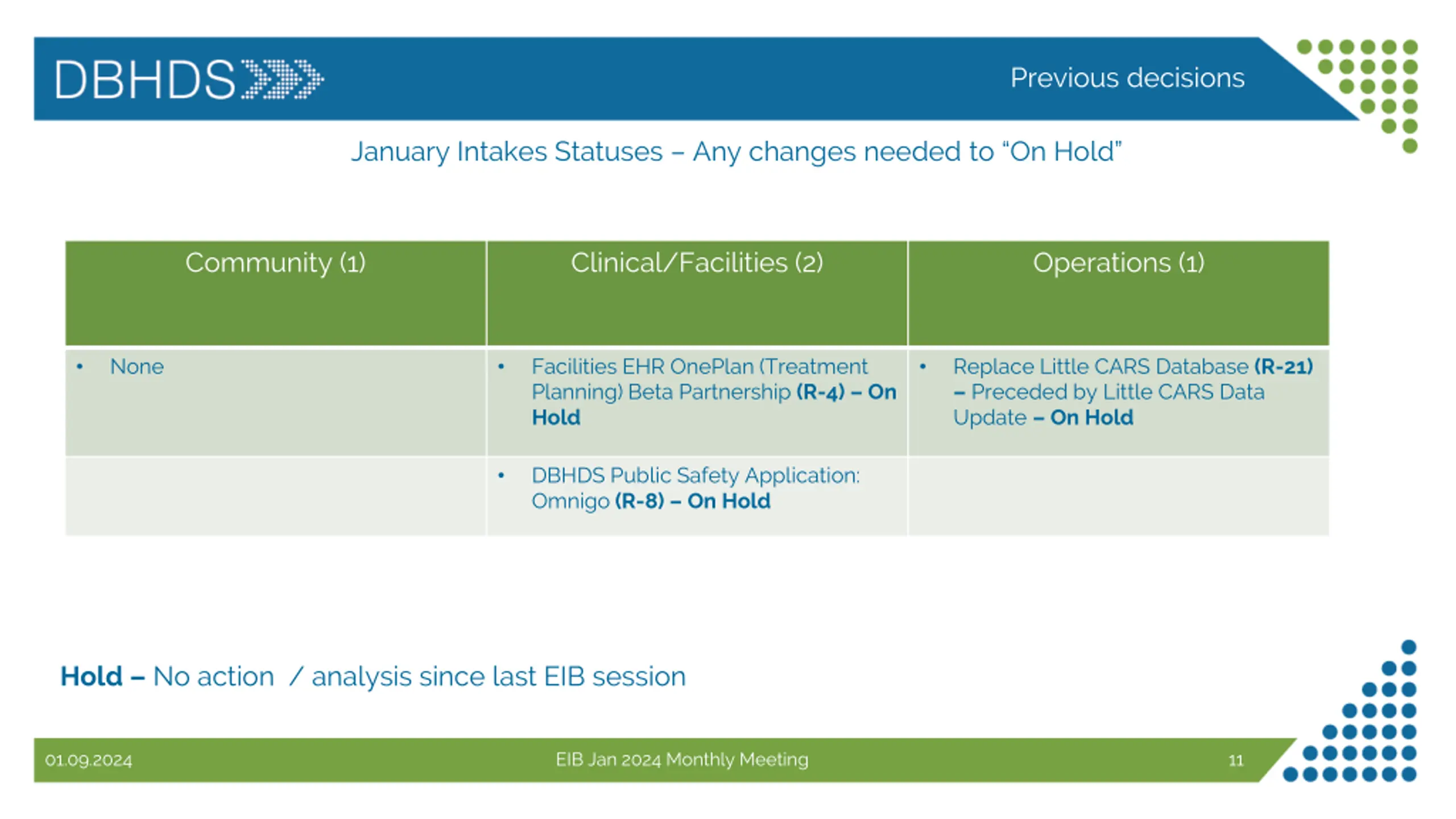 Previous decisions January Intakes Statuses Any changes needed to On Hold Community (1) Clinical/Facilities (2) Operations (1) None Facilities EHR OnePlan (Treatment Planning) Beta Partnership (R-4) On Hold Replace Little CARS Database (R-21) Preceded by Little CARS Data Update On Hold DBHDS Public Safety Application: Omnigo (R-8) On Hold Hold No action / analysis since last EIB session 01.09.2024 EIB Jan 2024 Monthly Meeting 11