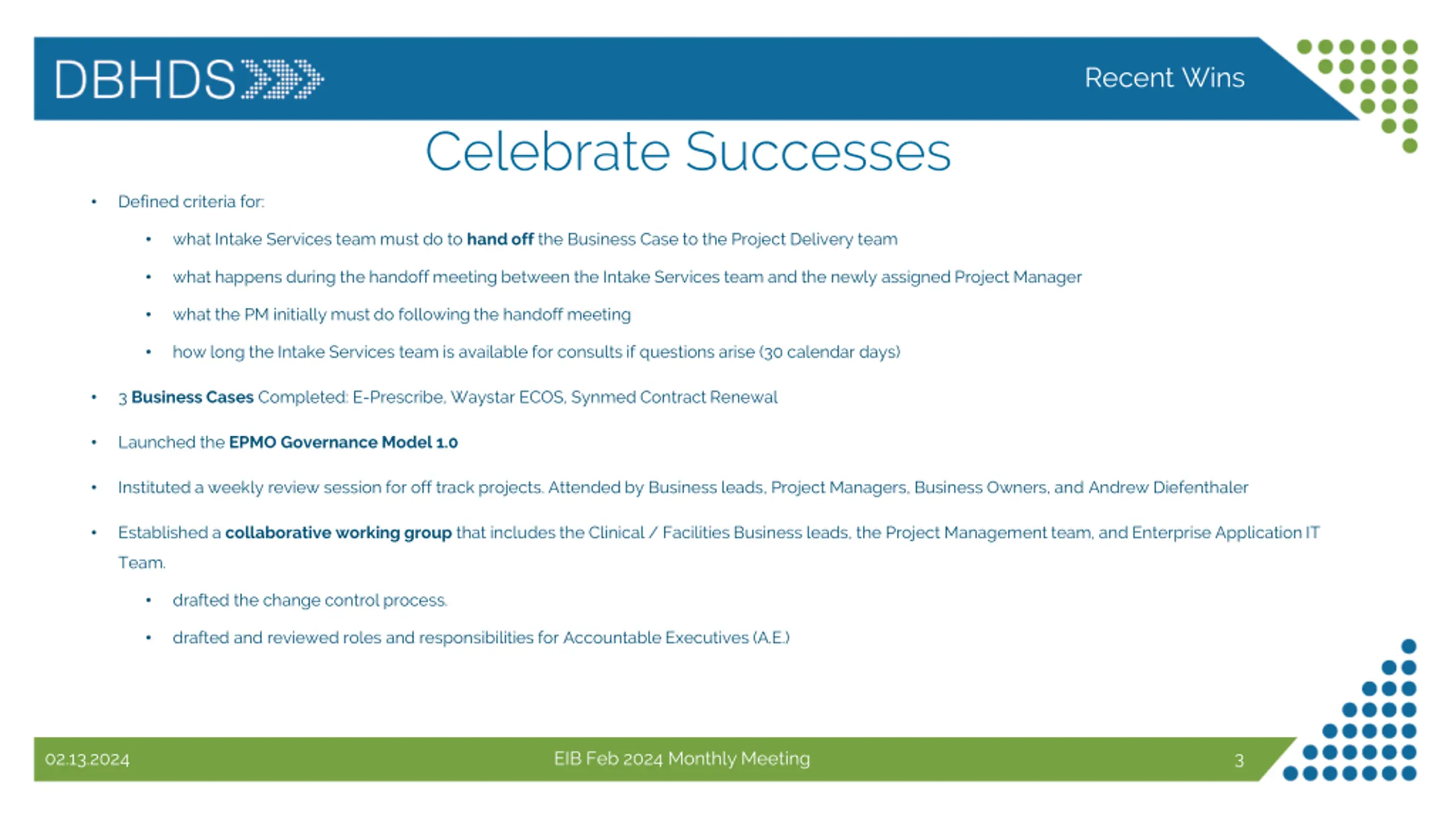Recent Wins Celebrate Successes Defined criteria for: what Intake Services team must do to hand off the Business Case to the Project Delivery team what happens during the handoff meeting between the Intake Services team and the newly assigned Project Manager what the PM initially must do following the handoff meeting how long the Intake Services team is available for consults if questions arise (30 calendar days) 3 Business Cases Completed: E-Prescribe, Waystar ECOS, Synmed Contract Renewal Launched the EPMO Governance Model 1.0 Instituted a weekly review session for off track projects. Attended by Business leads, Project Managers, Business Owners, and Andrew Diefenthaler Established a collaborative working group that includes the Clinical / Facilities Business leads, the Project Management team, and Enterprise Application IT Team. drafted the change control process. drafted and reviewed roles and responsibilities for Accountable Executives (A.E.) 02.13.2024 EIB Feb 2024 Monthly Meeting 3