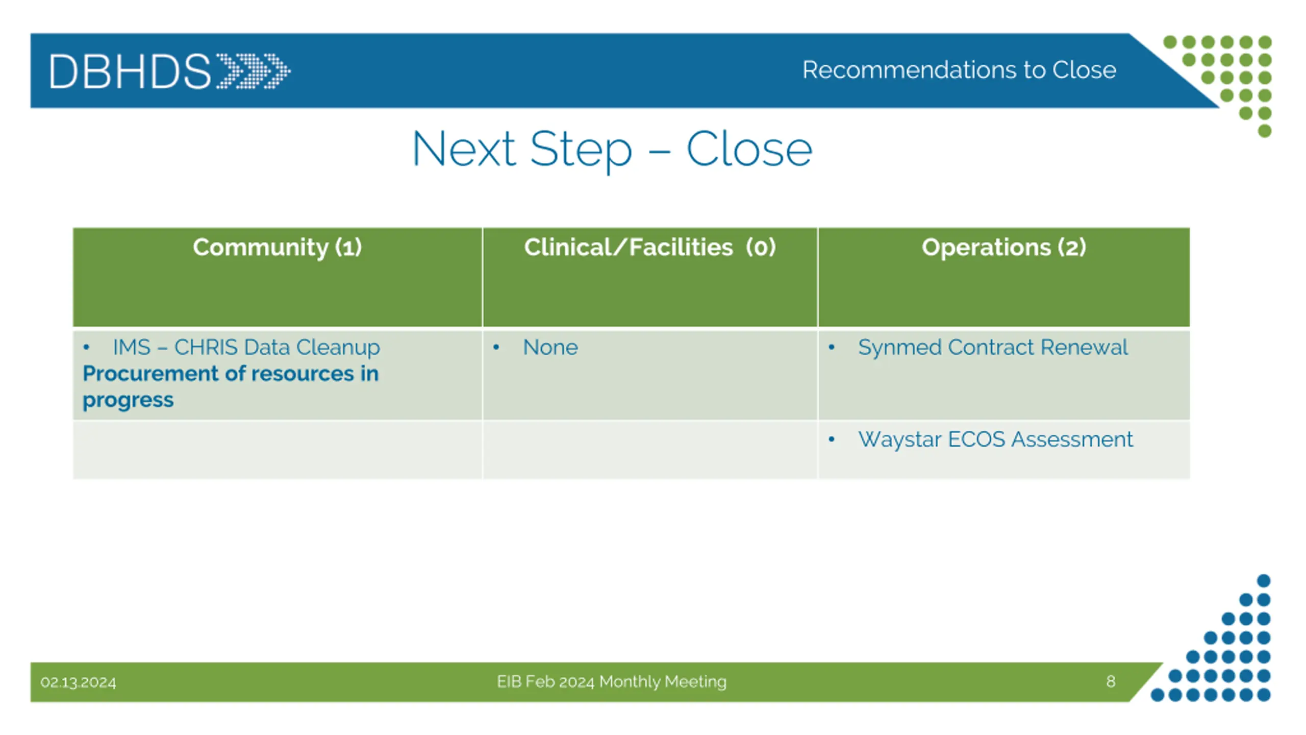 Recommendations to Close Next Step Close Community (1) Clinical/Facilities (0) Operations (2) IMS CHRIS Data Cleanup None Synmed Contract Renewal Procurement of resources in progress Waystar ECOS Assessment 02.13.2024 EIB Feb 2024 Monthly Meeting 8