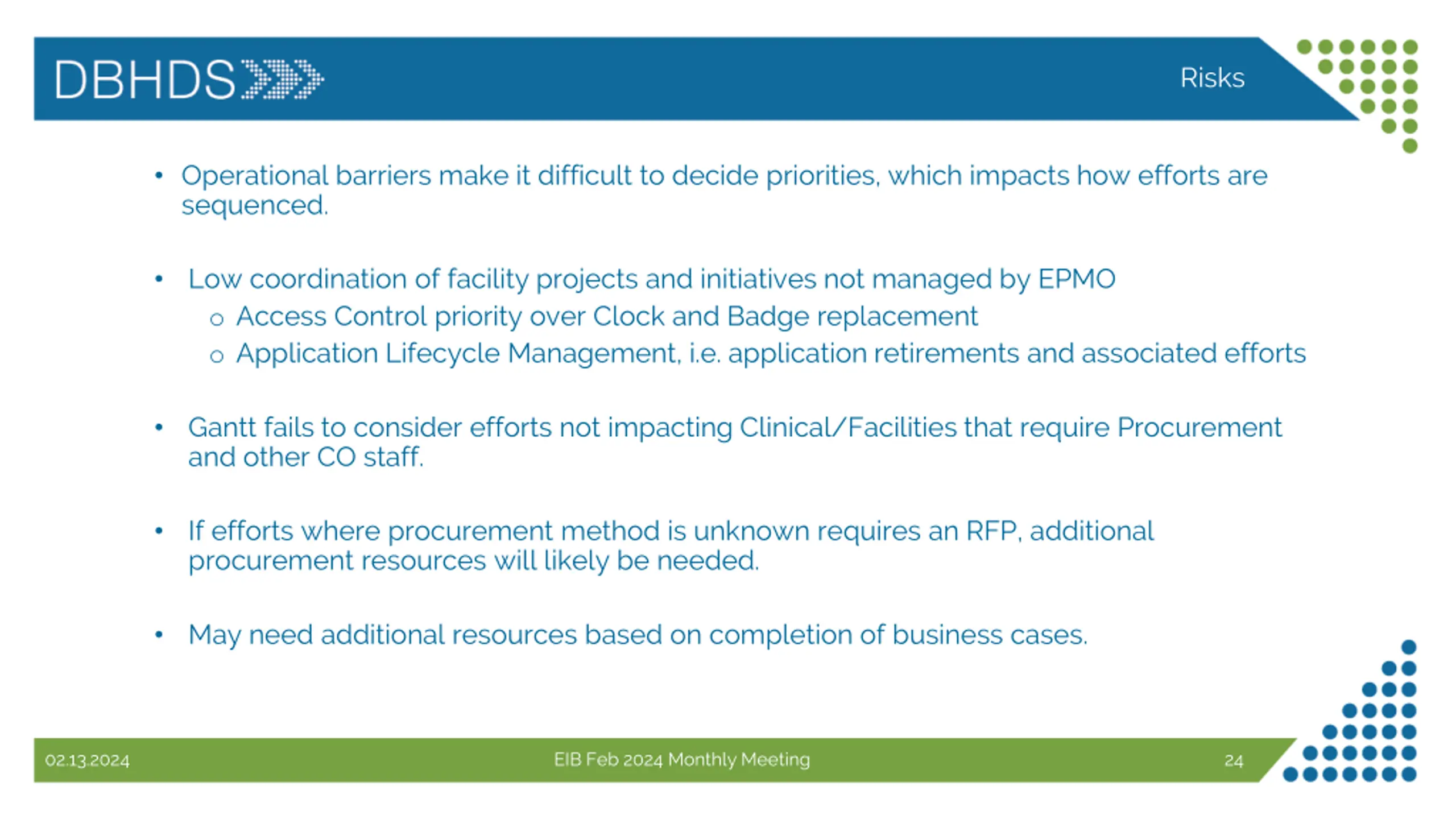 Risks Operational barriers make it difficult to decide priorities, which impacts how efforts are sequenced. Low coordination of facility projects and initiatives not managed by EPMO o Access Control priority over Clock and Badge replacement o Application Lifecycle Management, i.e. application retirements and associated efforts Gantt fails to consider efforts not impacting Clinical/Facilities that require Procurement and other CO staff. If efforts where procurement method is unknown requires an RFP, additional procurement resources will likely be needed. May need additional resources based on completion of business cases. 02.13.2024 EIB Feb 2024 Monthly Meeting 24
