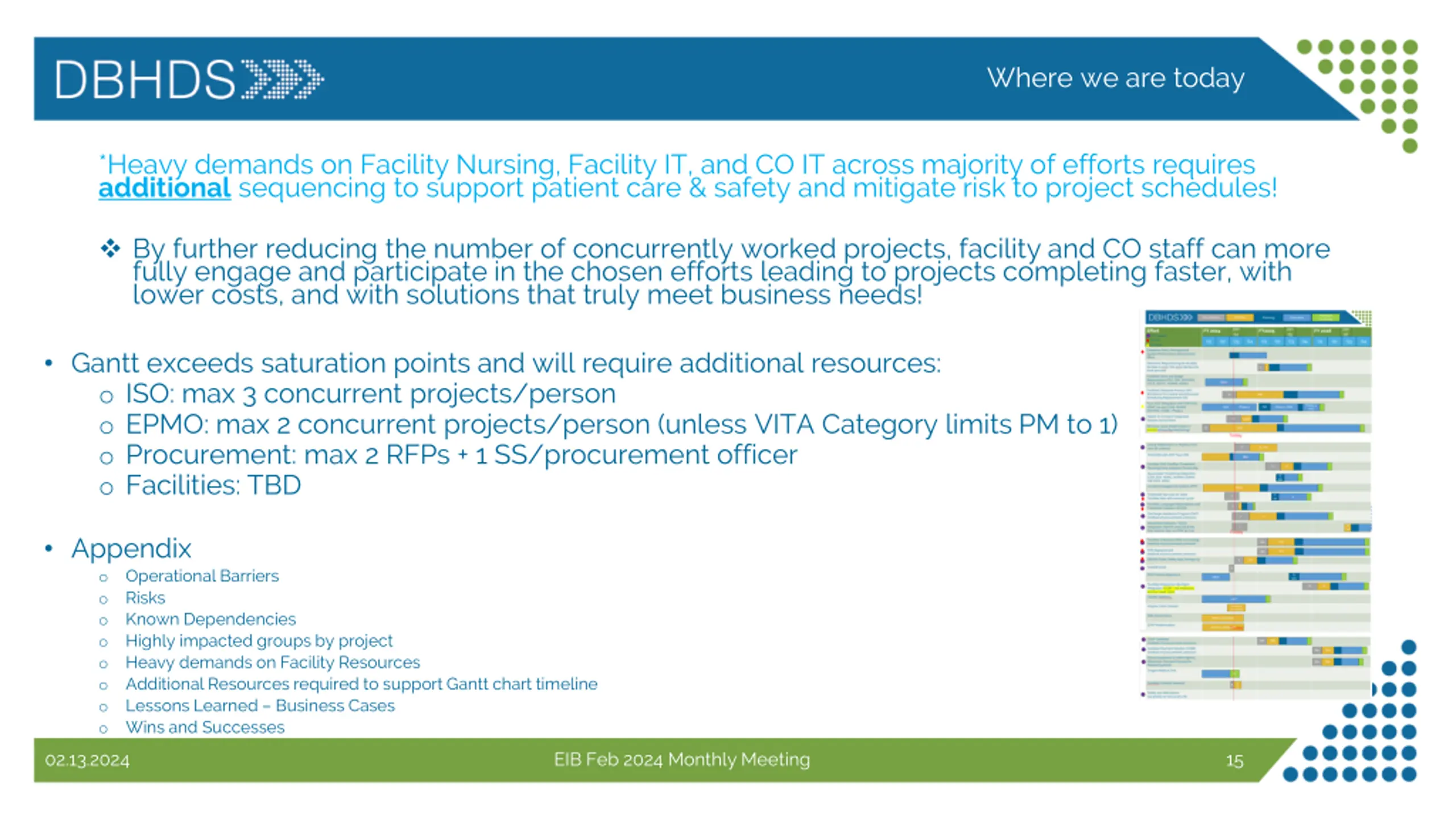 Where we are today *Heavy demands on Facility Nursing, Facility IT, and CO IT across majority of efforts requires additional sequencing to support patient care & safety and mitigate risk to project schedules! By further reducing the number of concurrently worked projects, facility and CO staff can more fully engage and participate in the chosen efforts leading to projects completing faster, with lower costs, and with solutions that truly meet business needs! Gantt exceeds saturation points and will require additional resources: o ISO: max 3 concurrent projects/person o EPMO: max 2 concurrent projects/person (unless VITA Category limits PM to 1) o Procurement: max 2 RFPs + 1 SS/procurement officer o Facilities: TBD Appendix o o o o o o o o Operational Barriers Risks Known Dependencies Highly impacted groups by project Heavy demands on Facility Resources Additional Resources required to support Gantt chart timeline Lessons Learned Business Cases Wins and Successes 02.13.2024 EIB Feb 2024 Monthly Meeting 15