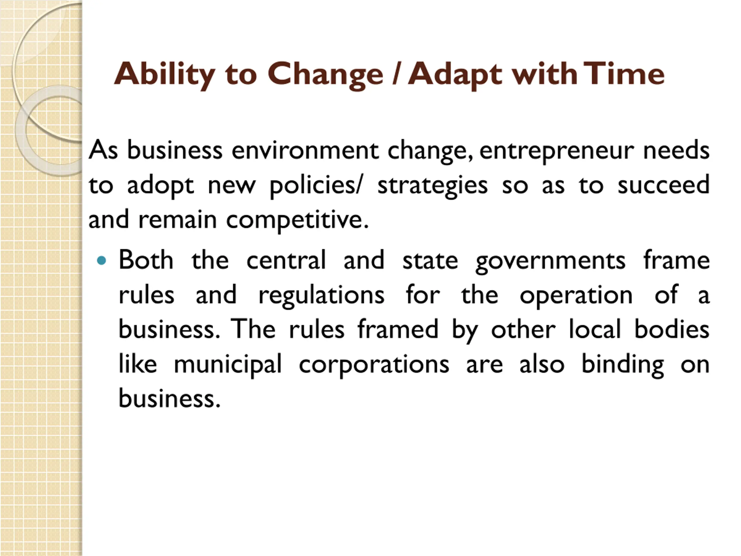 Ability to Change / Adapt with Time As business environment change,entrepreneur needs to adopt new policies/ strategies so as to succeed and remain competitive. Both the central and state governments frame rules and regulations for the operation of a business. The rules framed by other local bodies like municipal corporations are also binding on business.