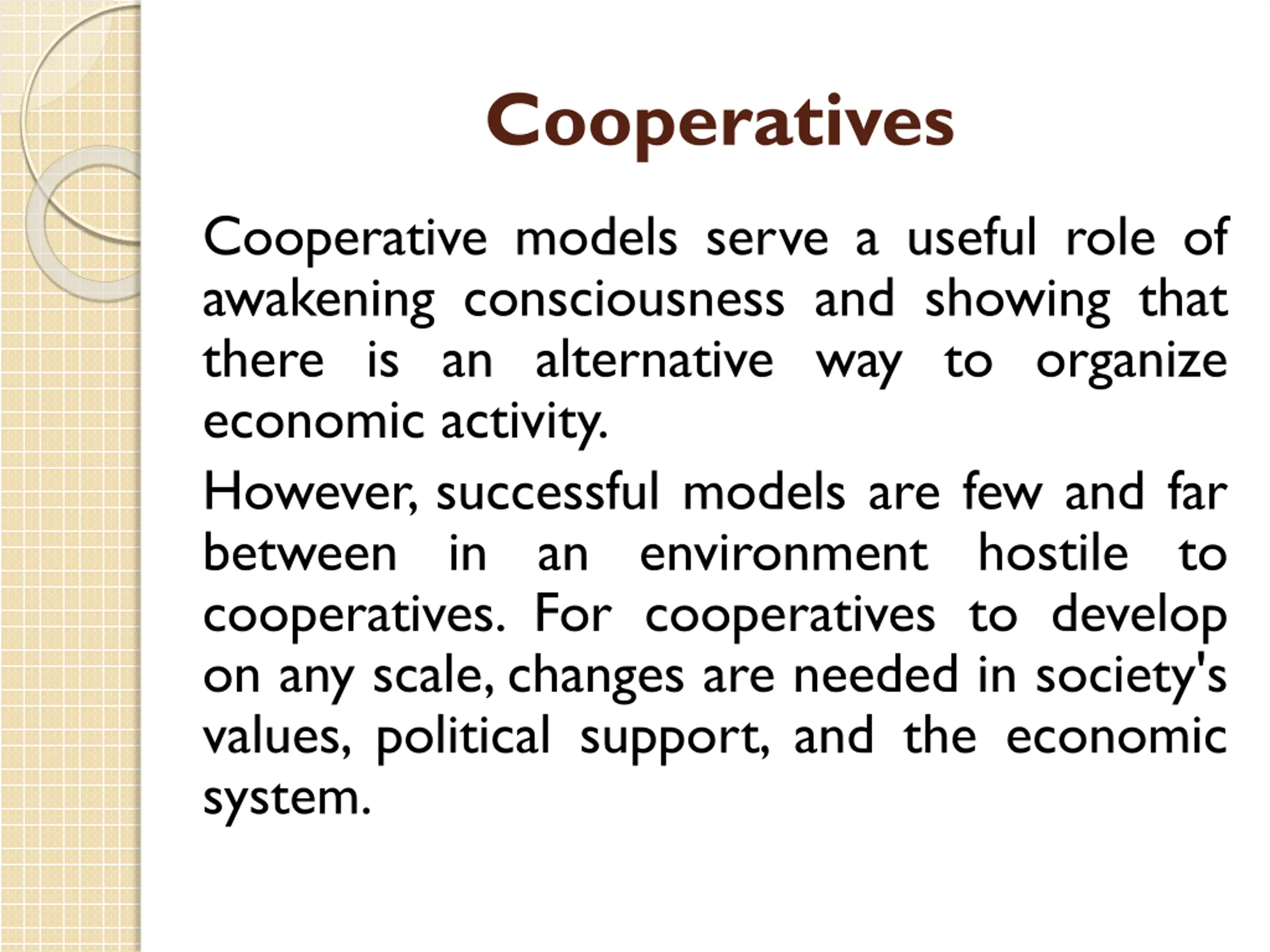 Cooperatives Cooperative models serve a useful role of awakening consciousness and showing that there is an alternative way to organize economic activity. However, successful models are few and far between in an environment hostile to cooperatives. For cooperatives to develop on any scale, changes are needed in society's values, political support, and the economic system.