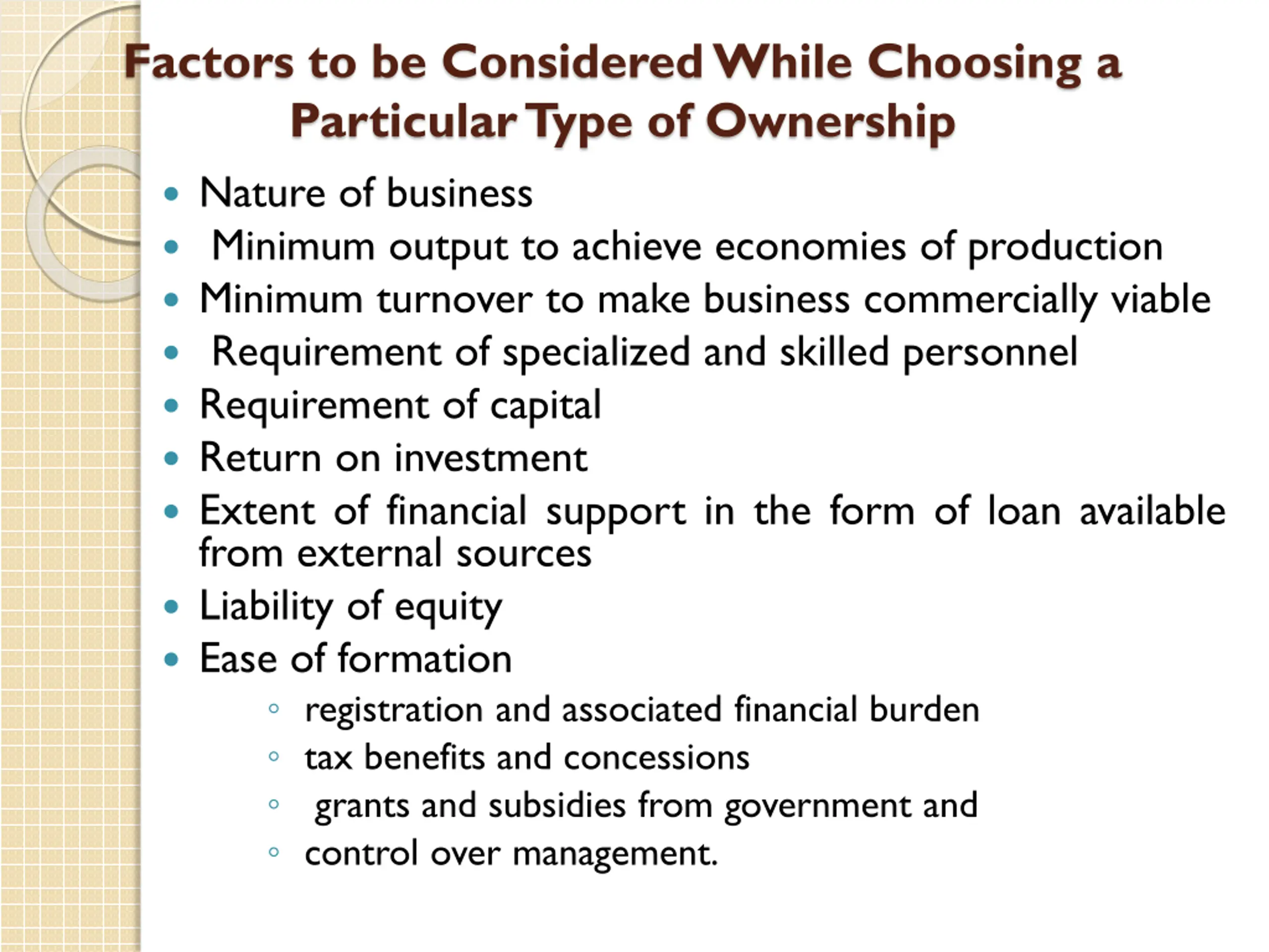 Factors to be Considered While Choosing a Particular Type of Ownership Nature of business Minimum output to achieve economies of production Minimum turnover to make business commercially viable Requirement of specialized and skilled personnel Requirement of capital Return on investment Extent of financial support in the form of loan available from external sources Liability of equity Ease of formation registration and associated financial burden tax benefits and concessions grants and subsidies from government and control over management.
