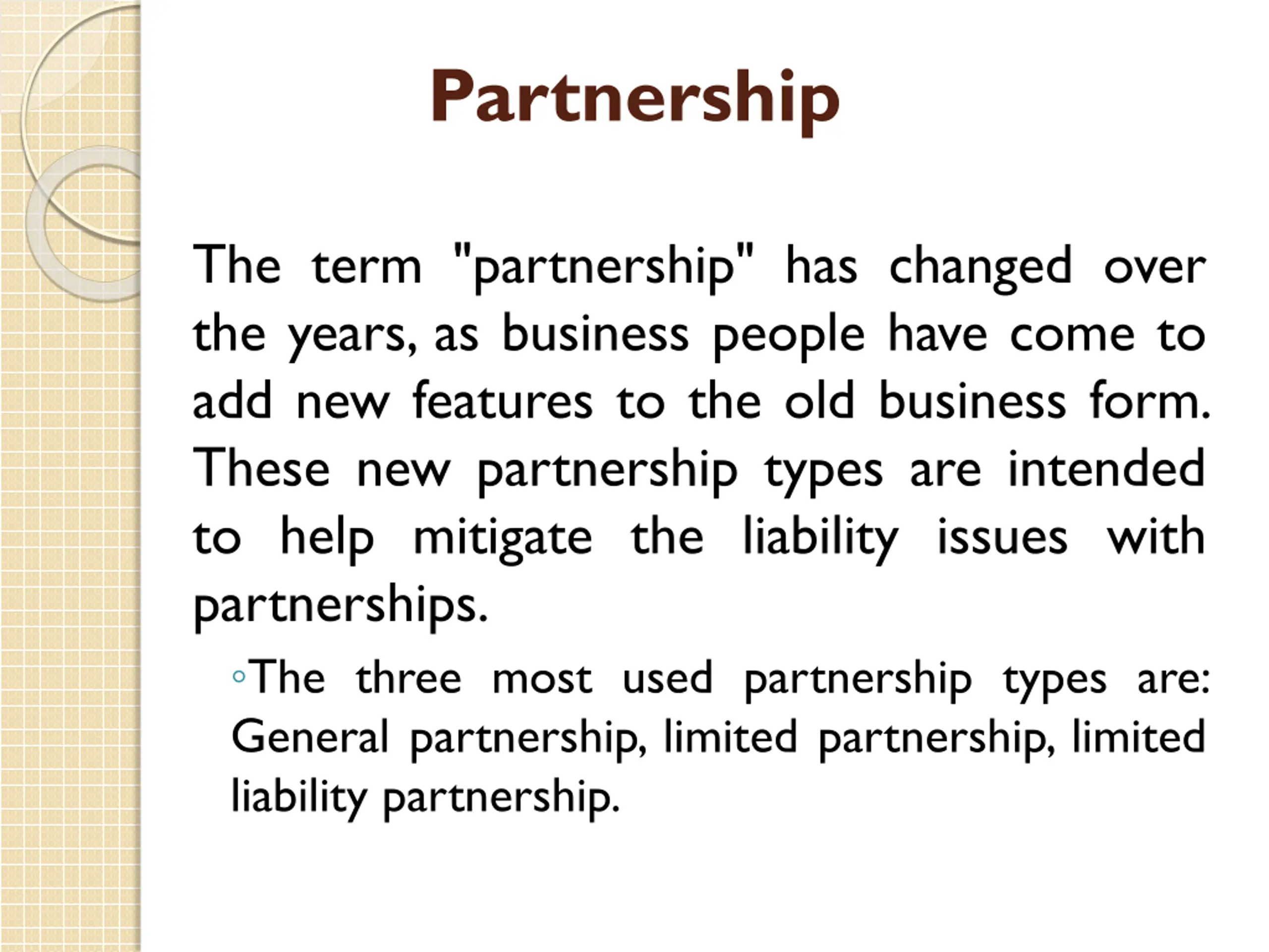 Partnership The term "partnership" has changed over the years, as business people have come to add new features to the old business form. These new partnership types are intended to help mitigate the liability issues with partnerships. The three most used partnership types are: General partnership, limited partnership, limited liability partnership.