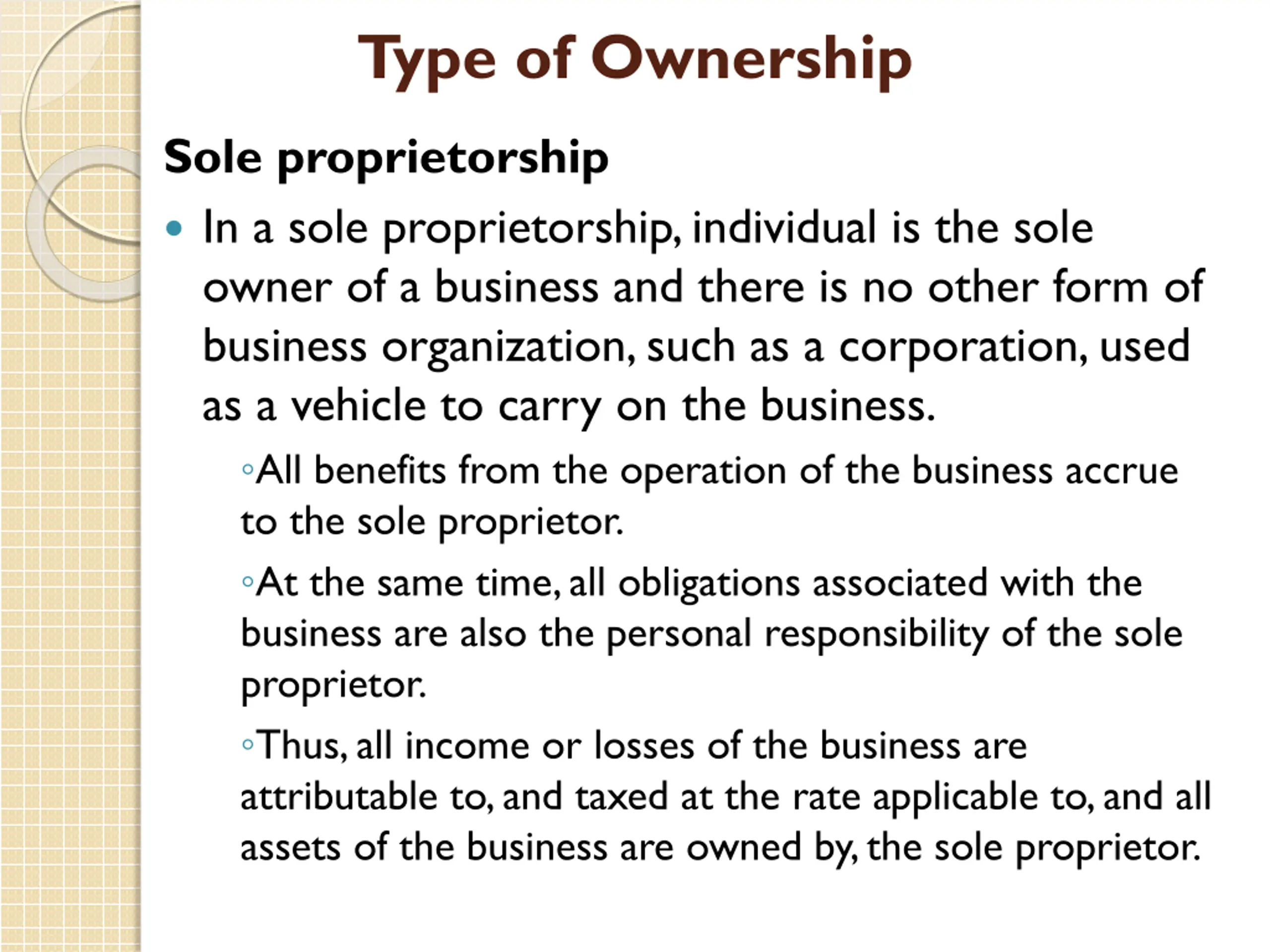 Type of Ownership Sole proprietorship In a sole proprietorship, individual is the sole owner of a business and there is no other form of business organization, such as a corporation, used as a vehicle to carry on the business. All benefits from the operation of the business accrue to the sole proprietor. At the same time, all obligations associated with the business are also the personal responsibility of the sole proprietor. Thus, all income or losses of the business are attributable to, and taxed at the rate applicable to, and all assets of the business are owned by, the sole proprietor.