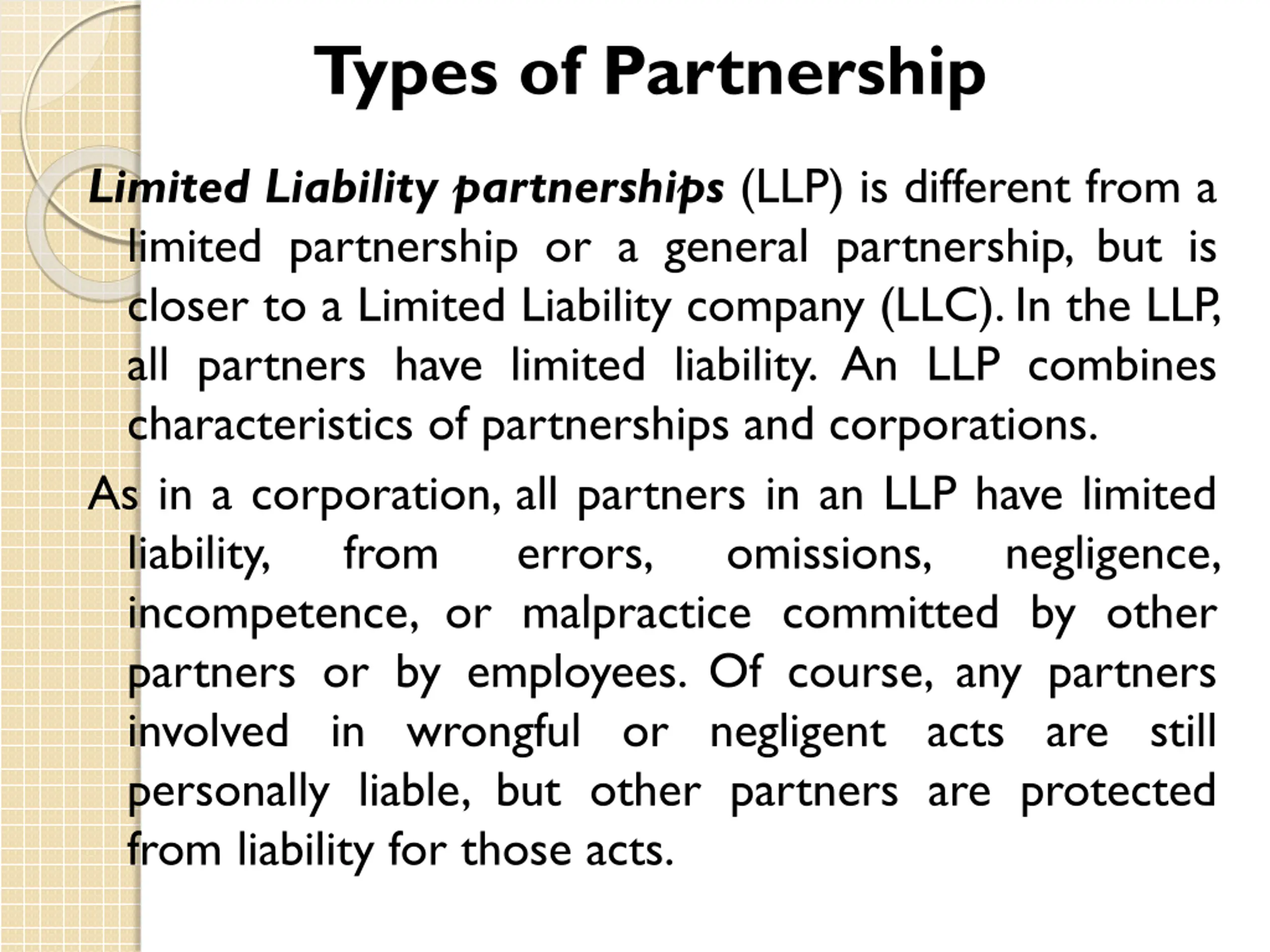 Types of Partnership Limited Liability partnerships (LLP) is different from a limited partnership or a general partnership, but is closer to a Limited Liability company (LLC). In the LLP, all partners have limited liability. An LLP combines characteristics of partnerships and corporations. As in a corporation, all partners in an LLP have limited liability, from errors, incompetence, or malpractice committed by other partners or by employees. Of course, any partners involved in wrongful or negligent acts are still personally liable, but other partners are protected from liability for those acts. omissions, negligence,