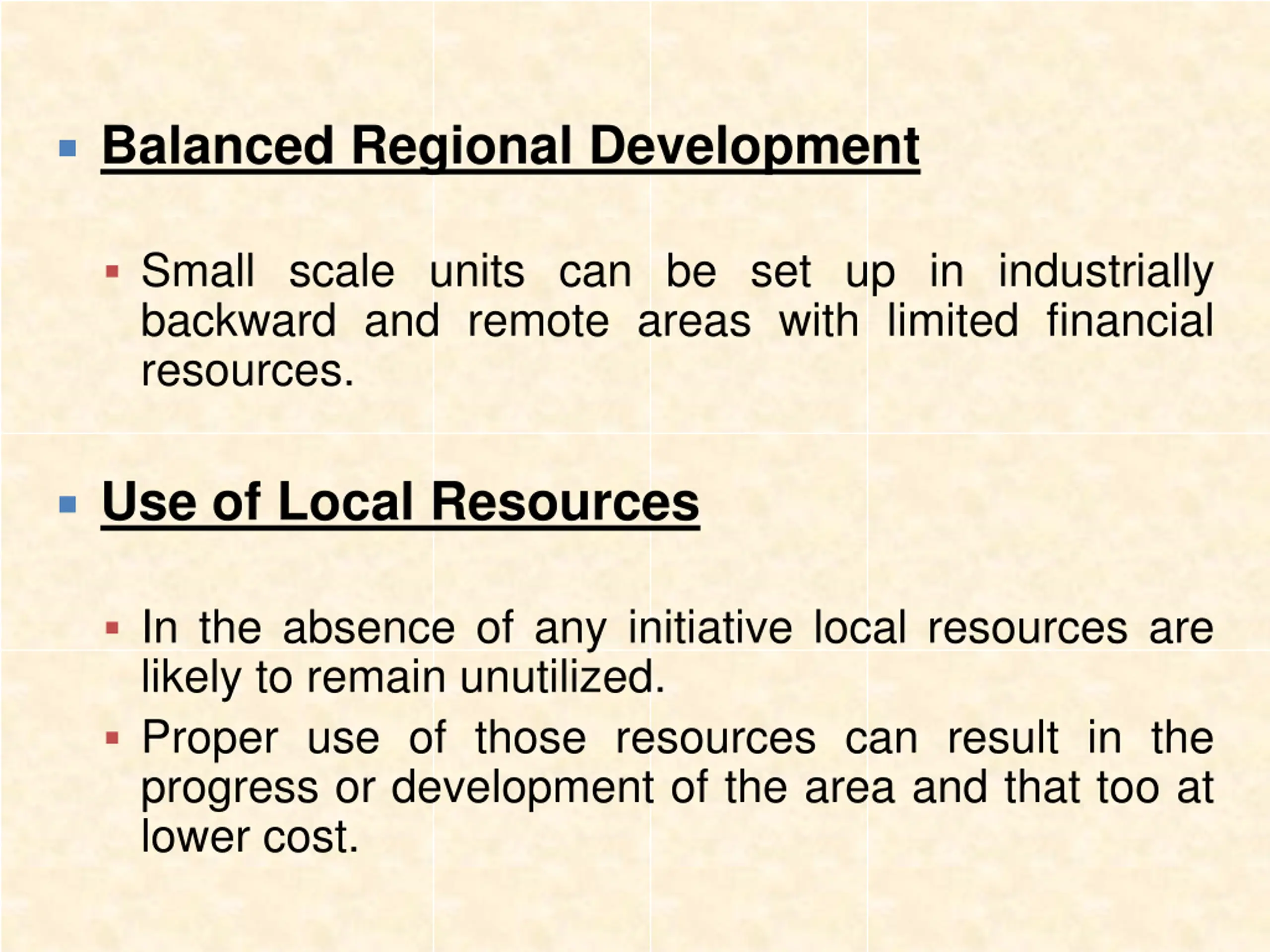 Balanced Regional Development Small scale units can be set up in industrially backward and remote areas with limited financial resources. Use of Local Resources In the absence of any initiative local resources are likely to remain unutilized. Proper use of those resources can result in the progress or development of the area and that too at lower cost.
