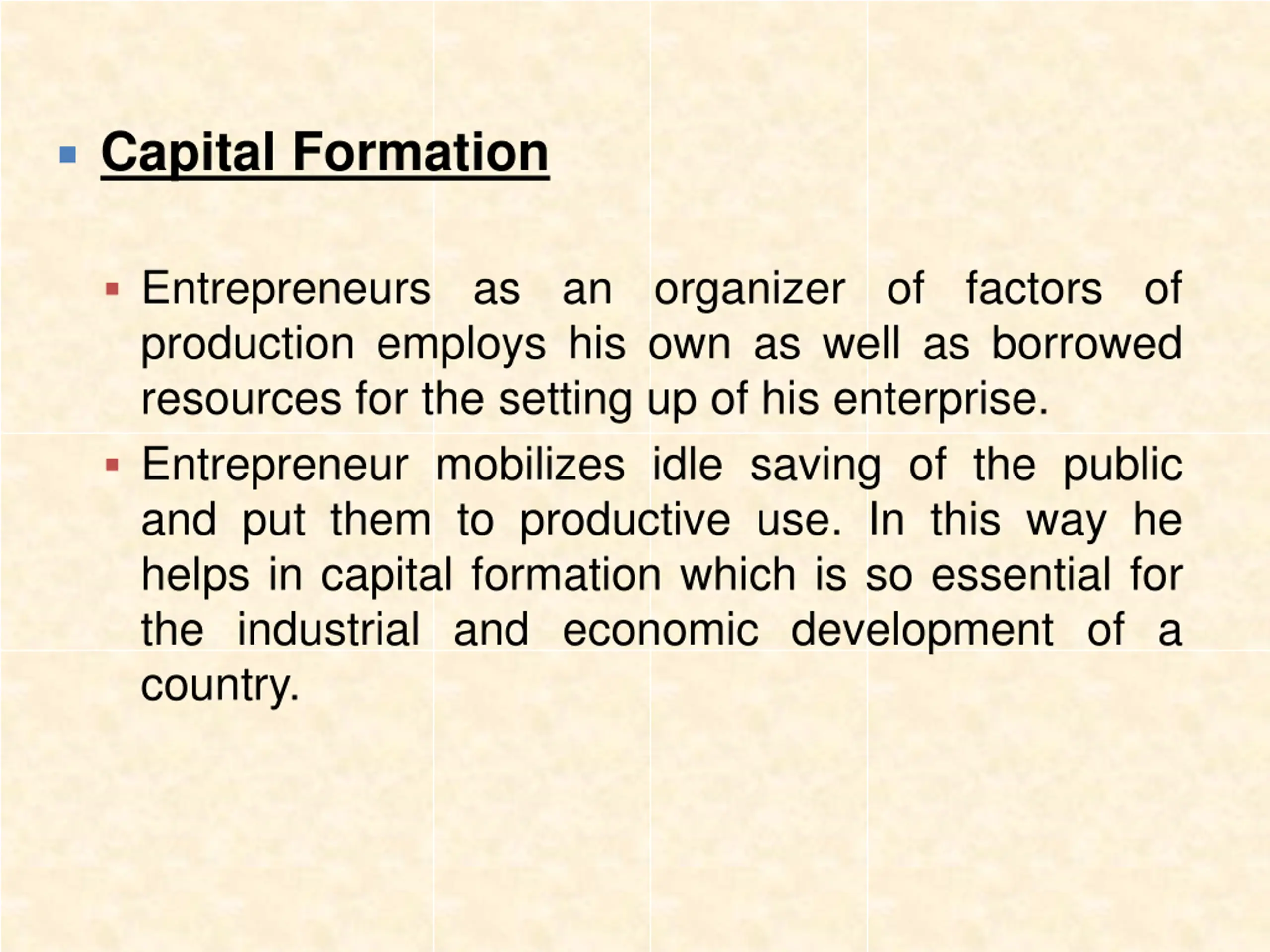 Capital Formation Entrepreneurs as an organizer of factors of production employs his own as well as borrowed resources for the setting up of his enterprise. Entrepreneur mobilizes idle saving of the public and put them to productive use. In this way he helps in capital formation which is so essential for the industrial and economic development of a country.