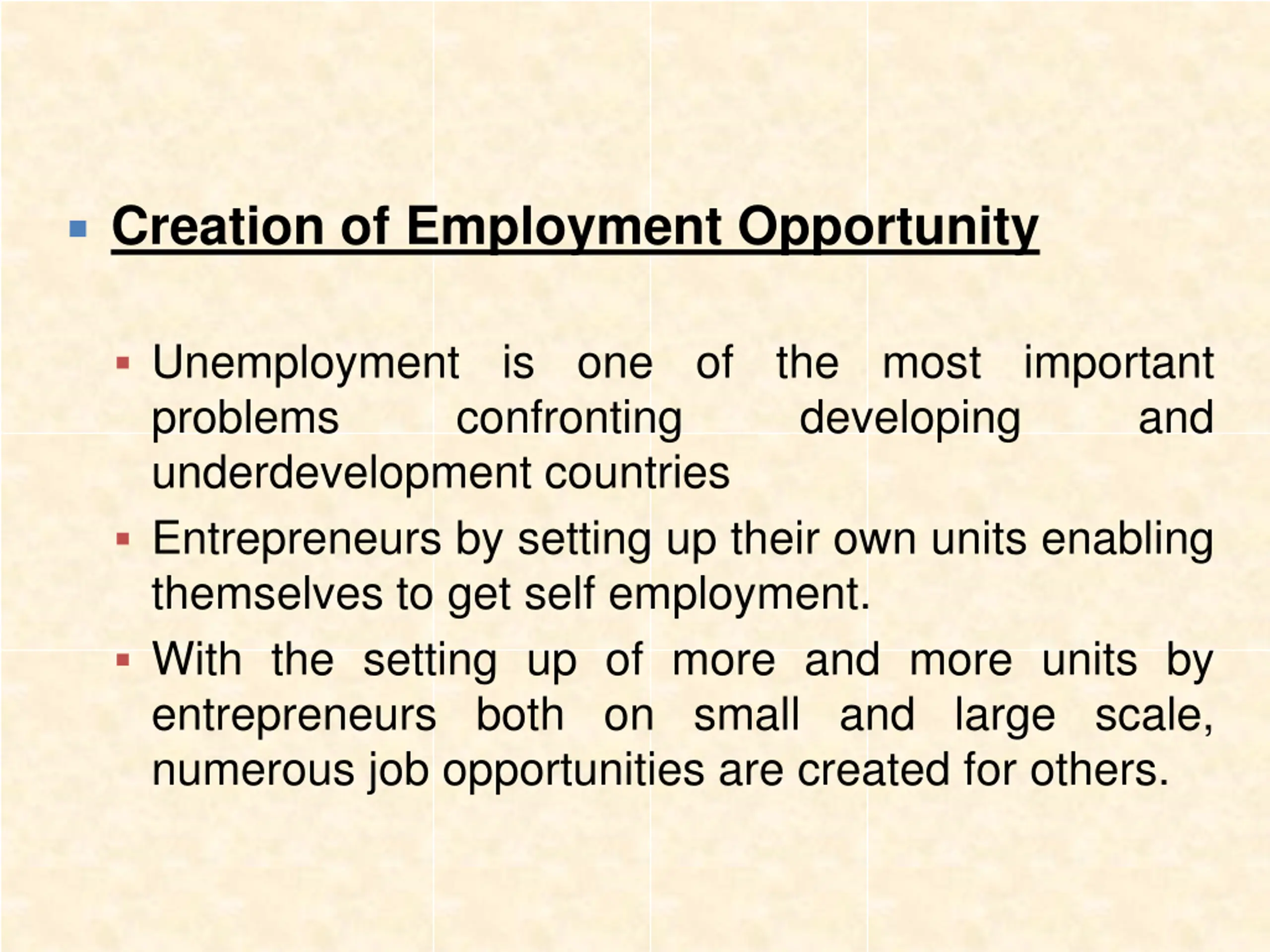 Creation of Employment Opportunity Unemployment is one of the most important problems confronting underdevelopment countries Entrepreneurs by setting up their own units enabling themselves to get self employment. With the setting up of more and more units by entrepreneurs both on small and large scale, numerous job opportunities are created for others. developing and