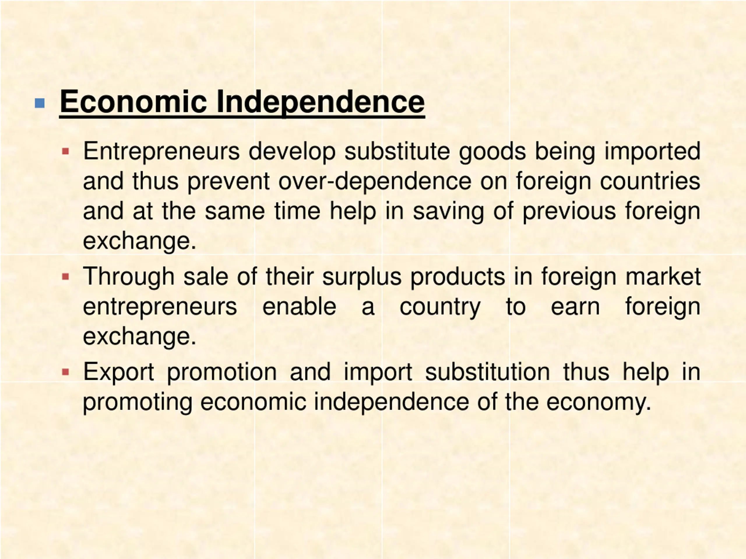 Economic Independence Entrepreneurs develop substitute goods being imported and thus prevent over-dependence on foreign countries and at the same time help in saving of previous foreign exchange. Through sale of their surplus products in foreign market entrepreneurs enable a country to earn foreign exchange. Export promotion and import substitution thus help in promoting economic independence of the economy.