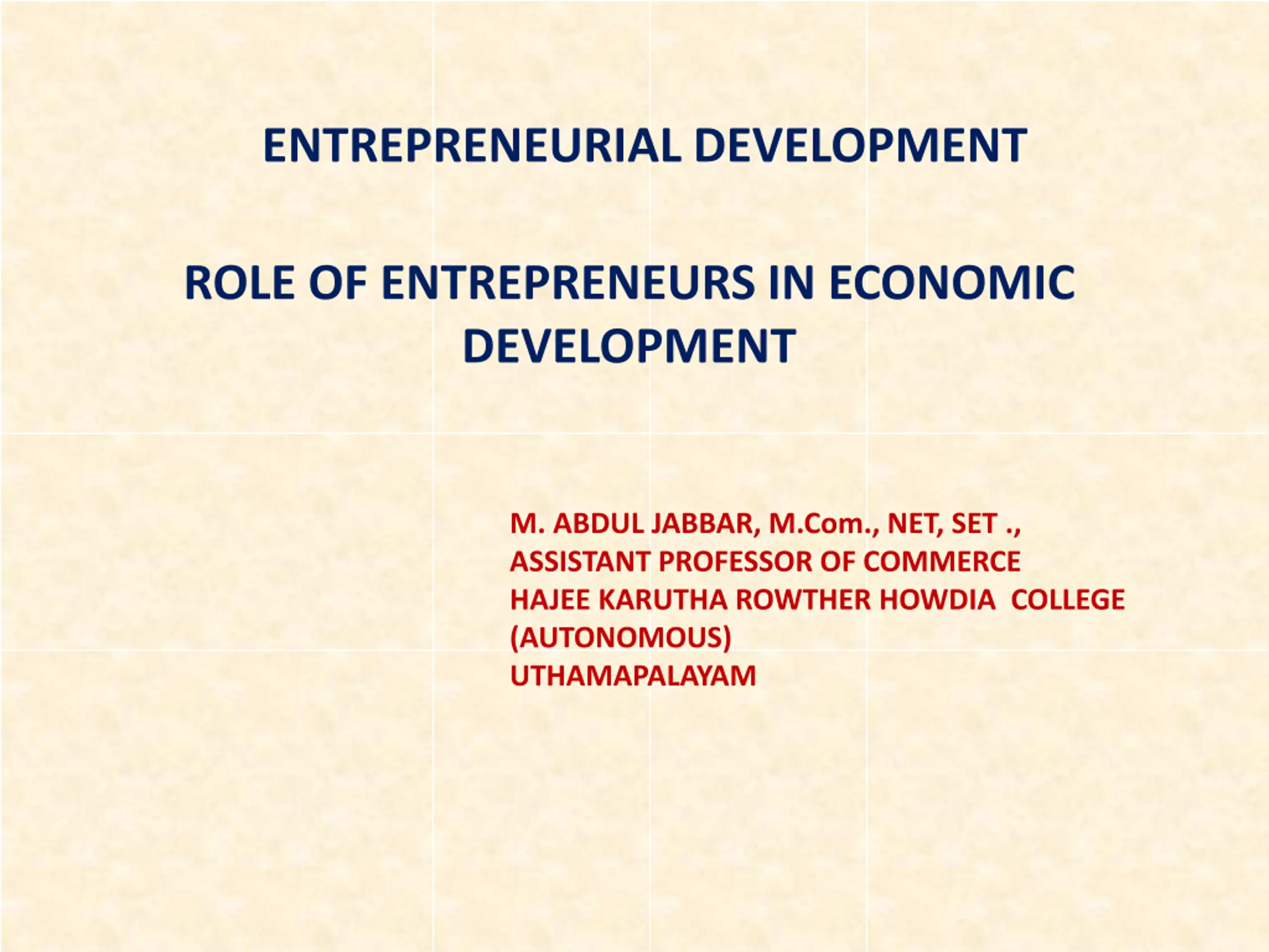 ENTREPRENEURIAL DEVELOPMENT ROLE OF ENTREPRENEURS IN ECONOMIC DEVELOPMENT M. ABDUL JABBAR, M.Com., NET, SET ., ASSISTANT PROFESSOR OF COMMERCE HAJEE KARUTHA ROWTHER HOWDIA COLLEGE (AUTONOMOUS) UTHAMAPALAYAM
