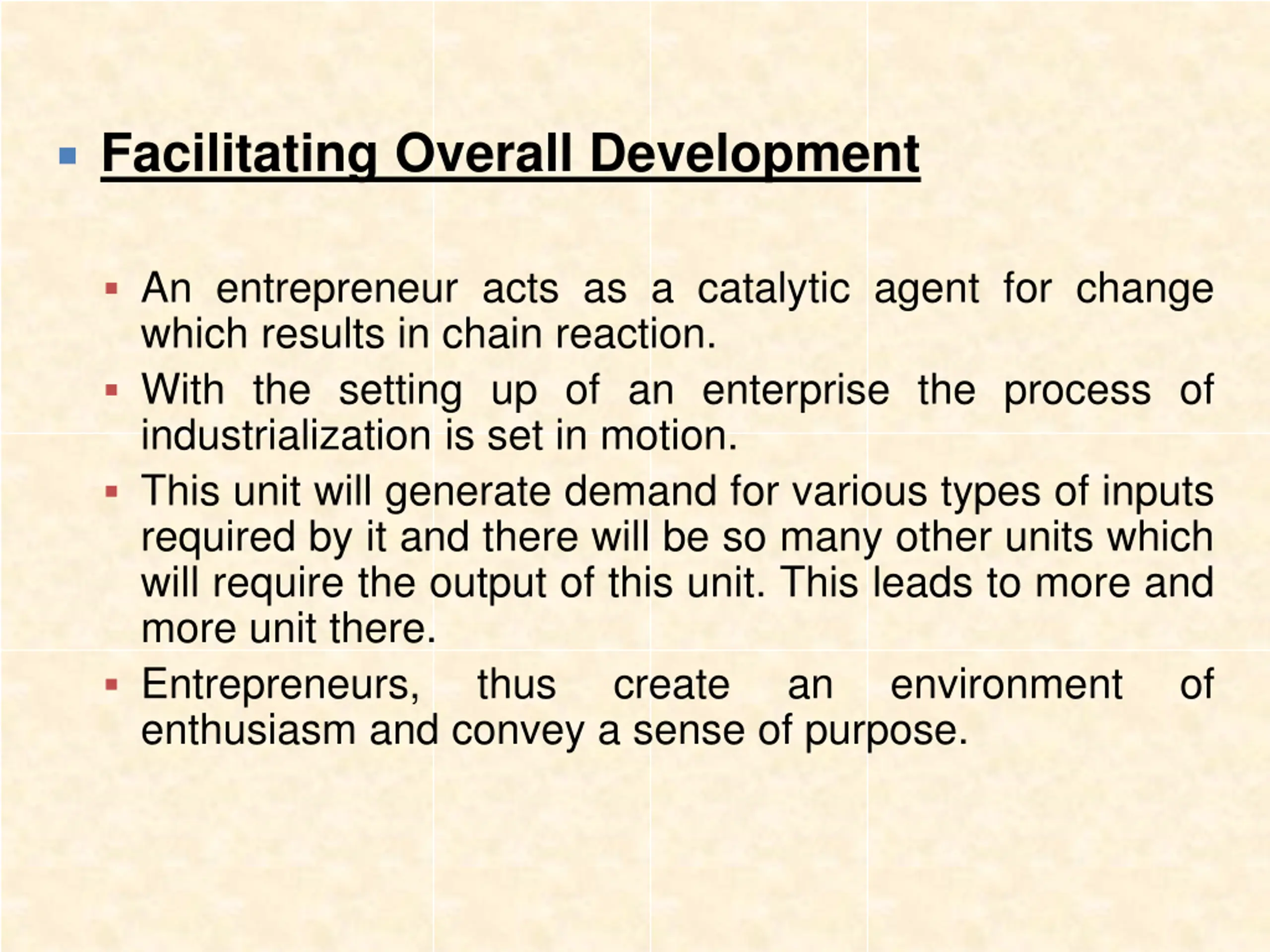 Facilitating Overall Development An entrepreneur acts as a catalytic agent for change which results in chain reaction. With the setting up of an enterprise the process of industrialization is set in motion. This unit will generate demand for various types of inputs required by it and there will be so many other units which will require the output of this unit. This leads to more and more unit there. Entrepreneurs, thus create enthusiasm and convey a sense of purpose. an environment of