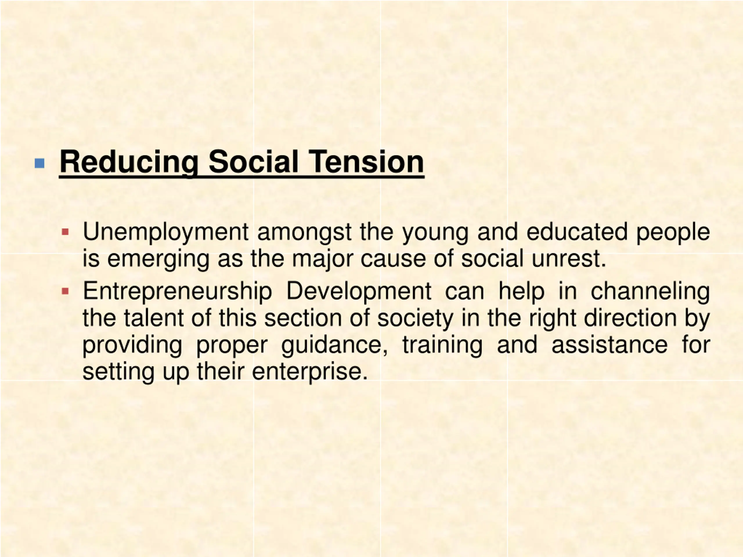 Reducing Social Tension Unemployment amongst the young and educated people is emerging as the major cause of social unrest. Entrepreneurship Development can help in channeling the talent of this section of society in the right direction by providing proper guidance, training and assistance for setting up their enterprise.