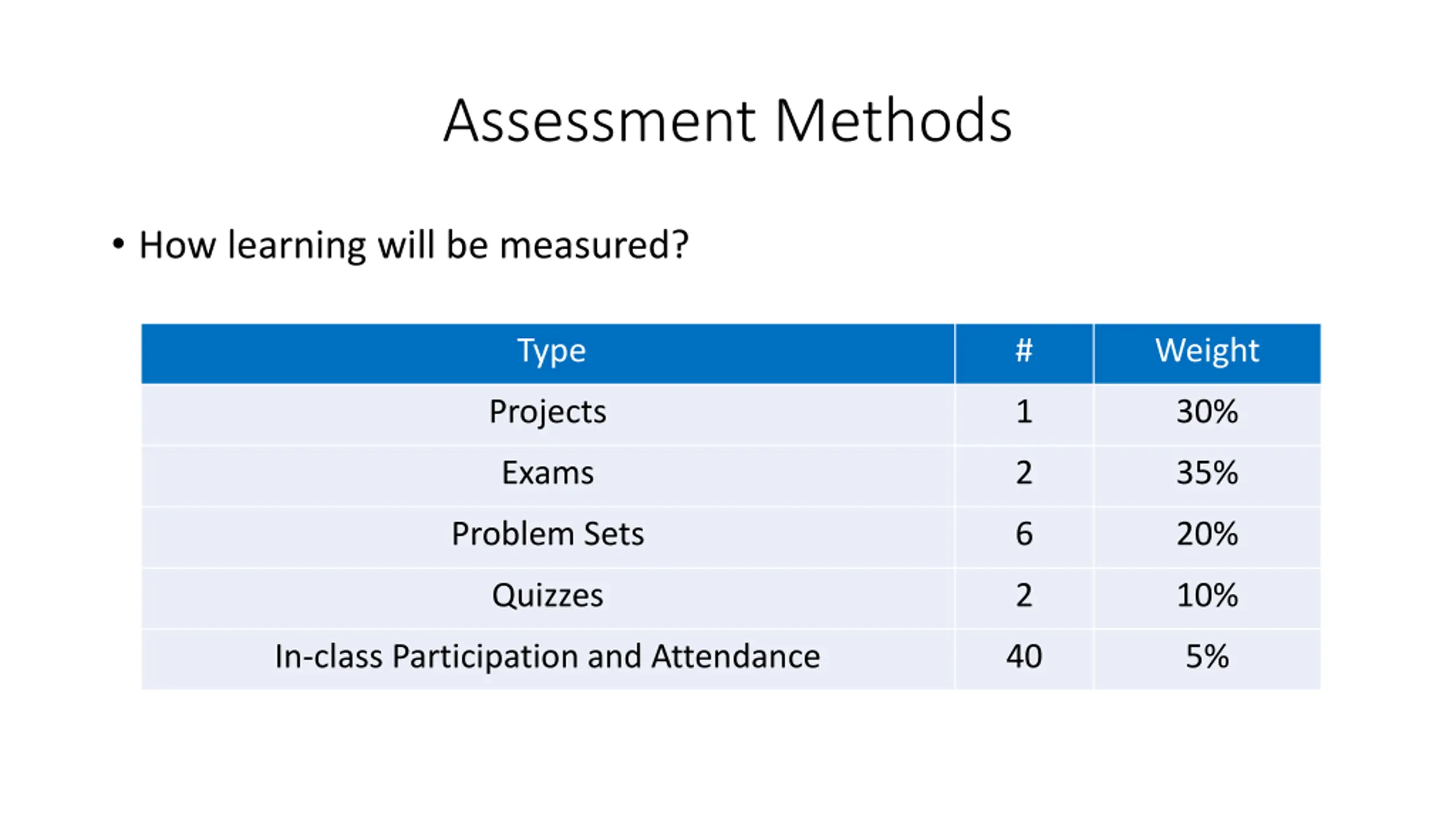 Assessment Methods How learning will be measured? Type # Weight Projects 1 30% Exams 2 35% Problem Sets 6 20% Quizzes 2 10% In-class Participation and Attendance 40 5%