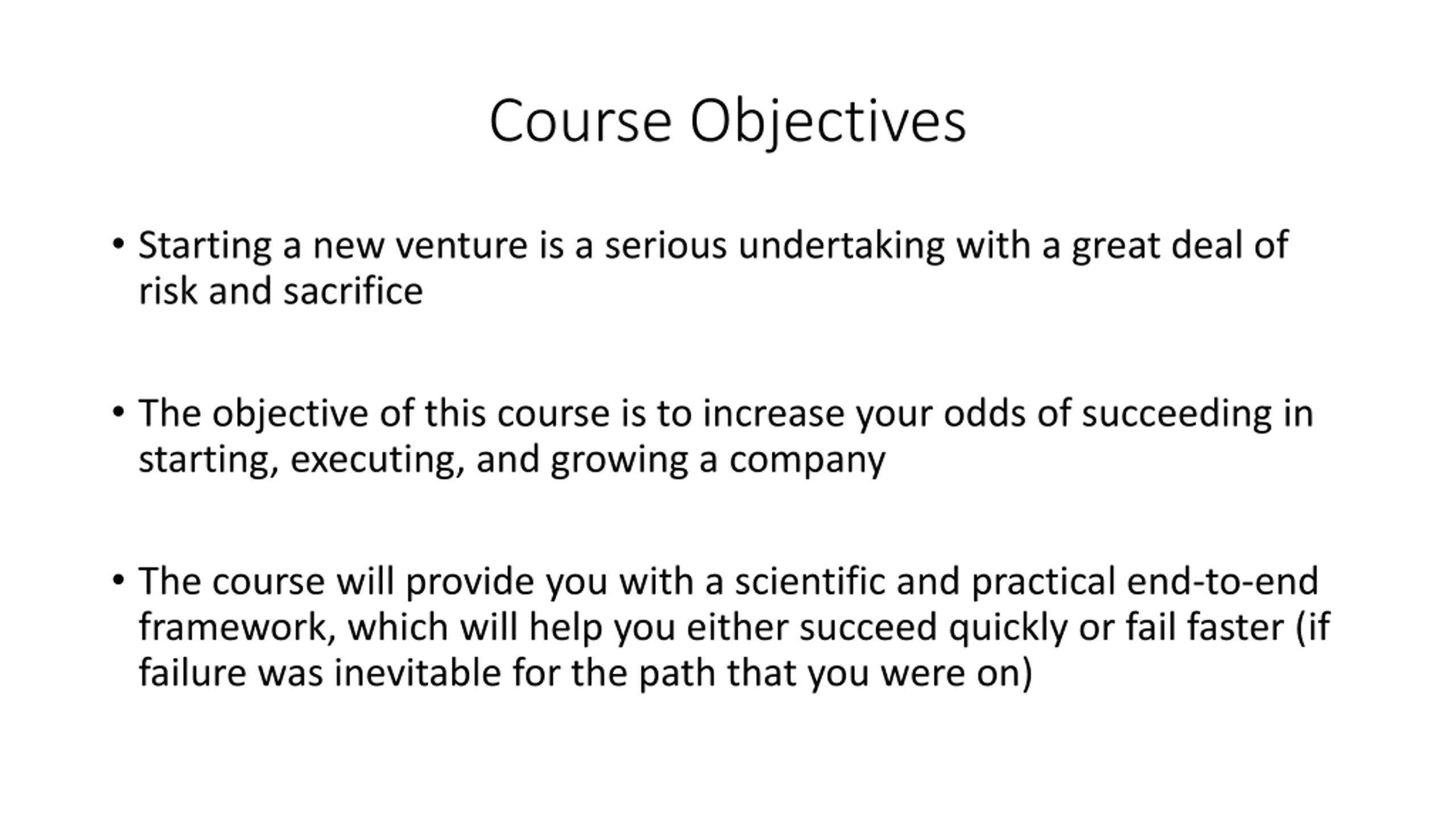 Course Objectives Starting a new venture is a serious undertaking with a great deal of risk and sacrifice The objective of this course is to increase your odds of succeeding in starting, executing, and growing a company The course will provide you with a scientific and practical end-to-end framework, which will help you either succeed quickly or fail faster (if failure was inevitable for the path that you were on)