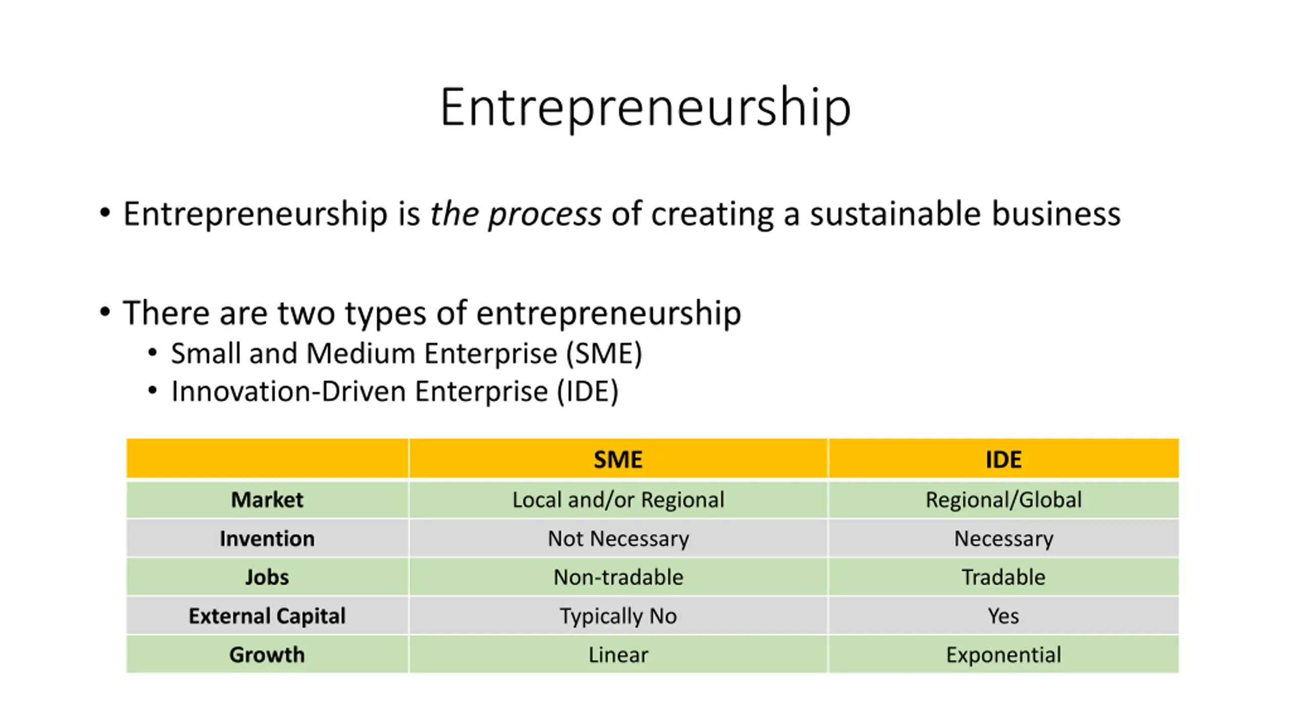 Entrepreneurship Entrepreneurship is the process of creating a sustainable business There are two types of entrepreneurship Small and Medium Enterprise (SME) Innovation-Driven Enterprise (IDE) SME SME SME SME SME SME IDE IDE IDE IDE IDE IDE Market Market Market Market Market Market Local and/or Regional Local and/or Regional Local and/or Regional Local and/or Regional Local and/or Regional Regional/Global Regional/Global Regional/Global Regional/Global Regional/Global Invention Invention Invention Invention Invention Invention Not Necessary Not Necessary Not Necessary Not Necessary Necessary Necessary Necessary Necessary Jobs Jobs Jobs Jobs Jobs Jobs Non-tradable Non-tradable Non-tradable Tradable Tradable Tradable External Capital External Capital External Capital External Capital External Capital External Capital Typically No Typically No Yes Yes Growth Growth Growth Growth Growth Growth Linear Exponential