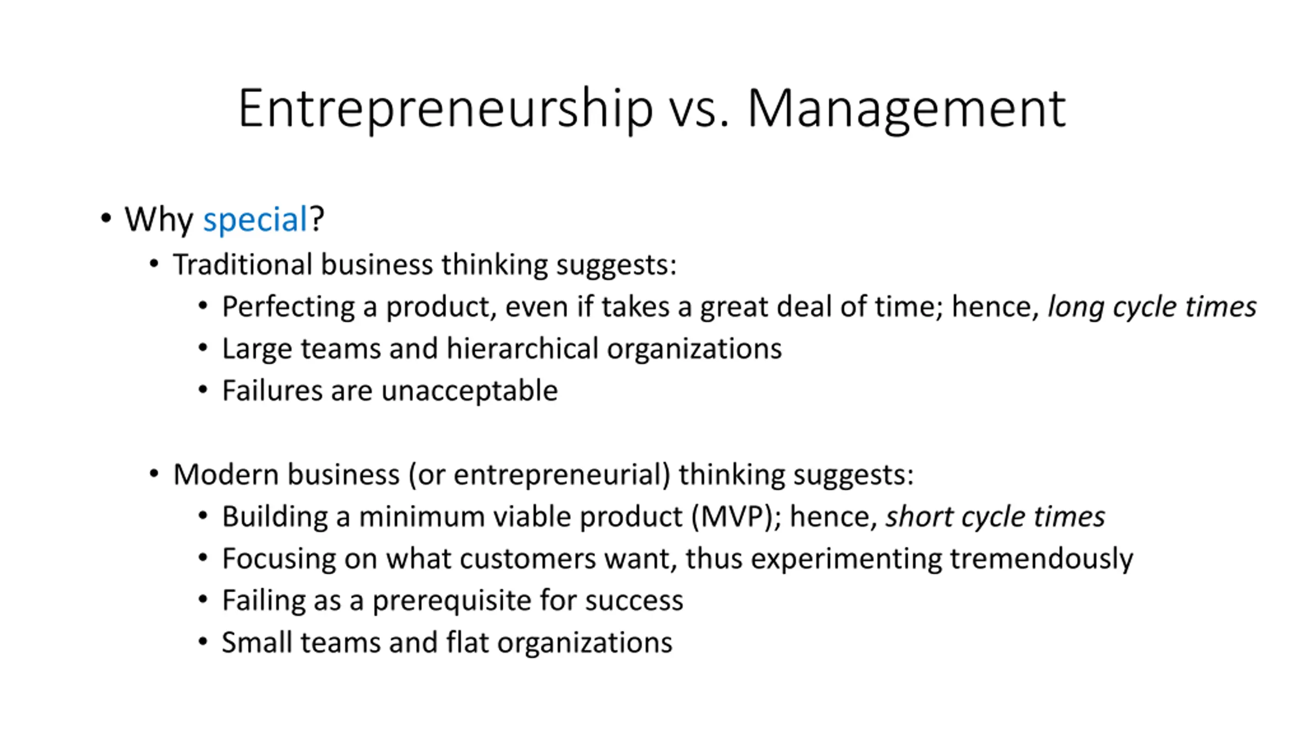 Entrepreneurship vs. Management Why special? Traditional business thinking suggests: Perfecting a product, even if takes a great deal of time; hence, long cycle times Large teams and hierarchical organizations Failures are unacceptable Modern business (or entrepreneurial) thinking suggests: Building a minimum viable product (MVP); hence, short cycle times Focusing on what customers want, thus experimenting tremendously Failing as a prerequisite for success Small teams and flat organizations