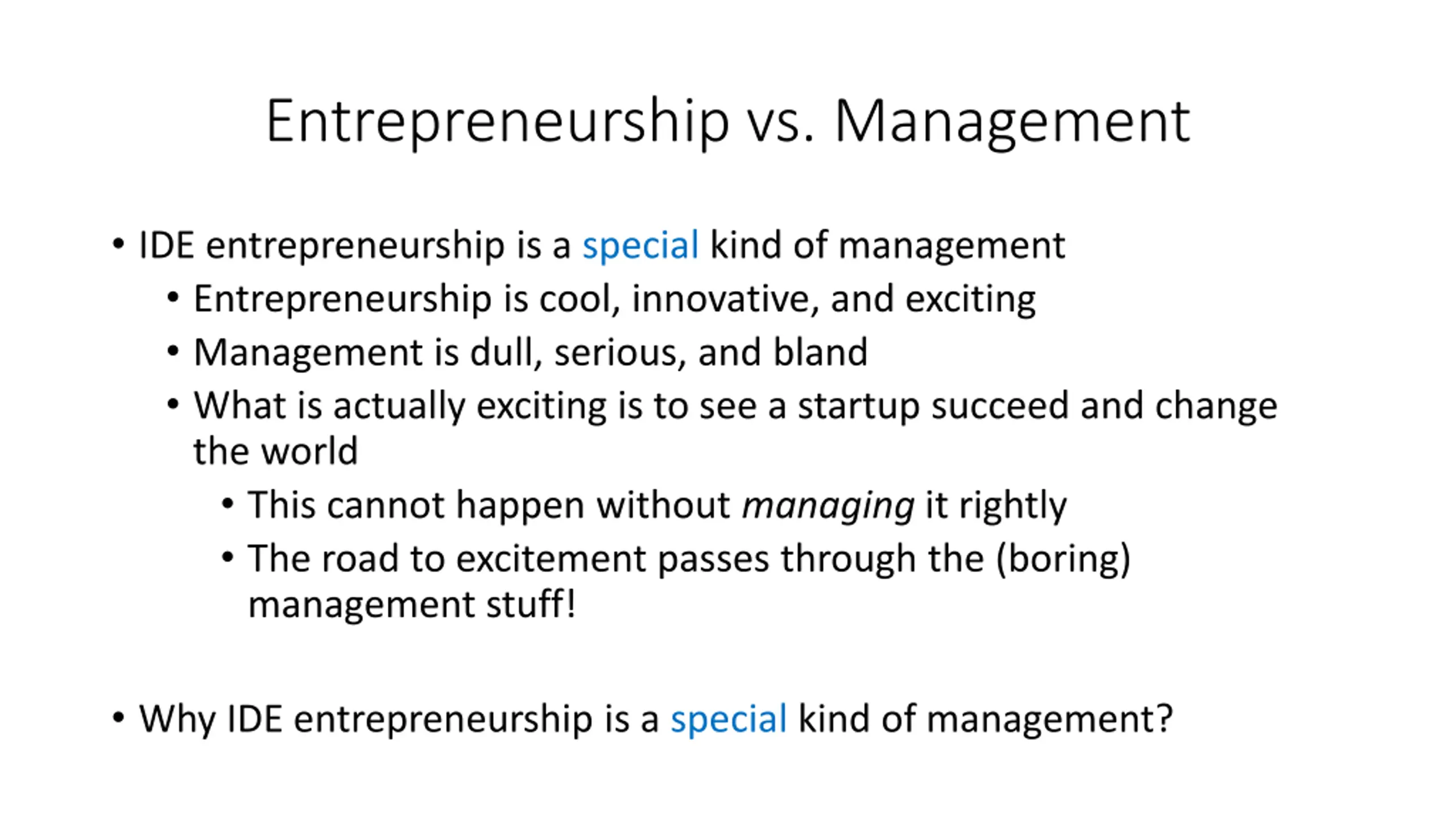 Entrepreneurship vs. Management IDE entrepreneurship is a special kind of management Entrepreneurship is cool, innovative, and exciting Management is dull, serious, and bland What is actually exciting is to see a startup succeed and change the world This cannot happen without managing it rightly The road to excitement passes through the (boring) management stuff! Why IDE entrepreneurship is a special kind of management?