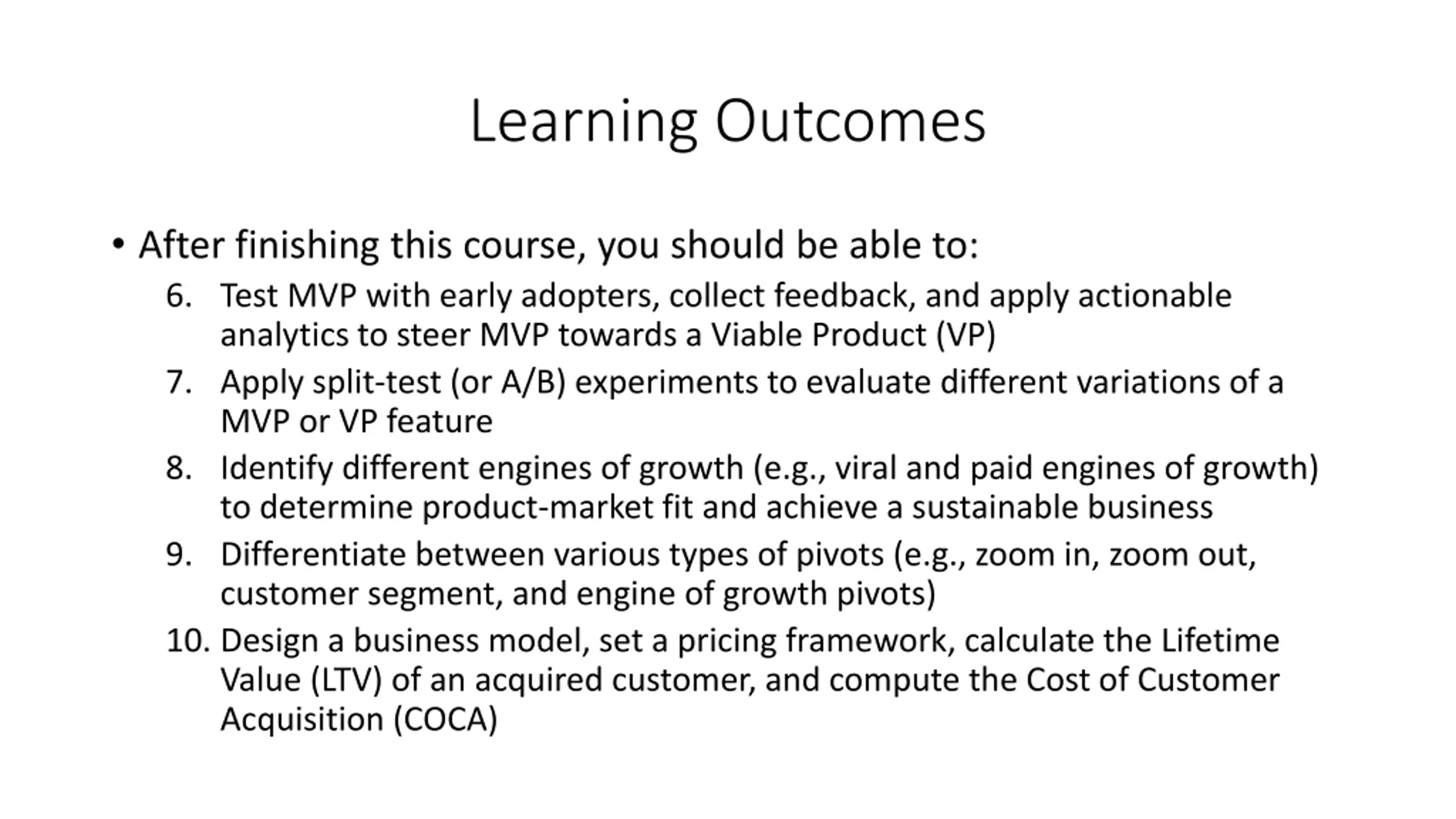 Learning Outcomes After finishing this course, you should be able to: 6. Test MVP with early adopters, collect feedback, and apply actionable analytics to steer MVP towards a Viable Product (VP) 7. Apply split-test (or A/B) experiments to evaluate different variations of a MVP or VP feature 8. Identify different engines of growth (e.g., viral and paid engines of growth) to determine product-market fit and achieve a sustainable business 9. Differentiate between various types of pivots (e.g., zoom in, zoom out, customer segment, and engine of growth pivots) 10. Design a business model, set a pricing framework, calculate the Lifetime Value (LTV) of an acquired customer, and compute the Cost of Customer Acquisition (COCA)