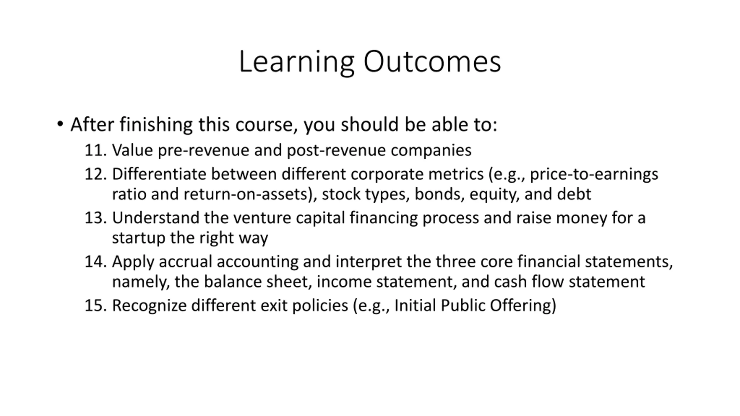 Learning Outcomes After finishing this course, you should be able to: 11. Value pre-revenue and post-revenue companies 12. Differentiate between different corporate metrics (e.g., price-to-earnings ratio and return-on-assets), stock types, bonds, equity, and debt 13. Understand the venture capital financing process and raise money for a startup the right way 14. Apply accrual accounting and interpret the three core financial statements, namely, the balance sheet, income statement, and cash flow statement 15. Recognize different exit policies (e.g., Initial Public Offering)