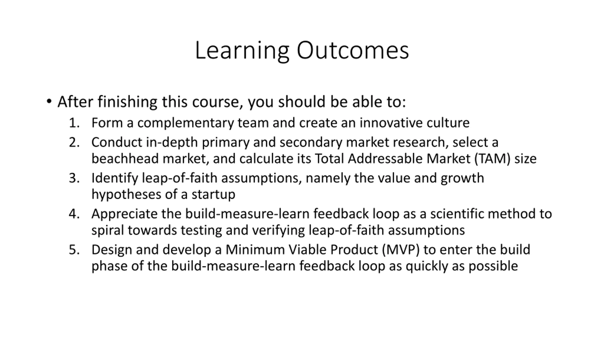 Learning Outcomes After finishing this course, you should be able to: 1. Form a complementary team and create an innovative culture 2. Conduct in-depth primary and secondary market research, select a beachhead market, and calculate its Total Addressable Market (TAM) size 3. Identify leap-of-faith assumptions, namely the value and growth hypotheses of a startup 4. Appreciate the build-measure-learn feedback loop as a scientific method to spiral towards testing and verifying leap-of-faith assumptions 5. Design and develop a Minimum Viable Product (MVP) to enter the build phase of the build-measure-learn feedback loop as quickly as possible