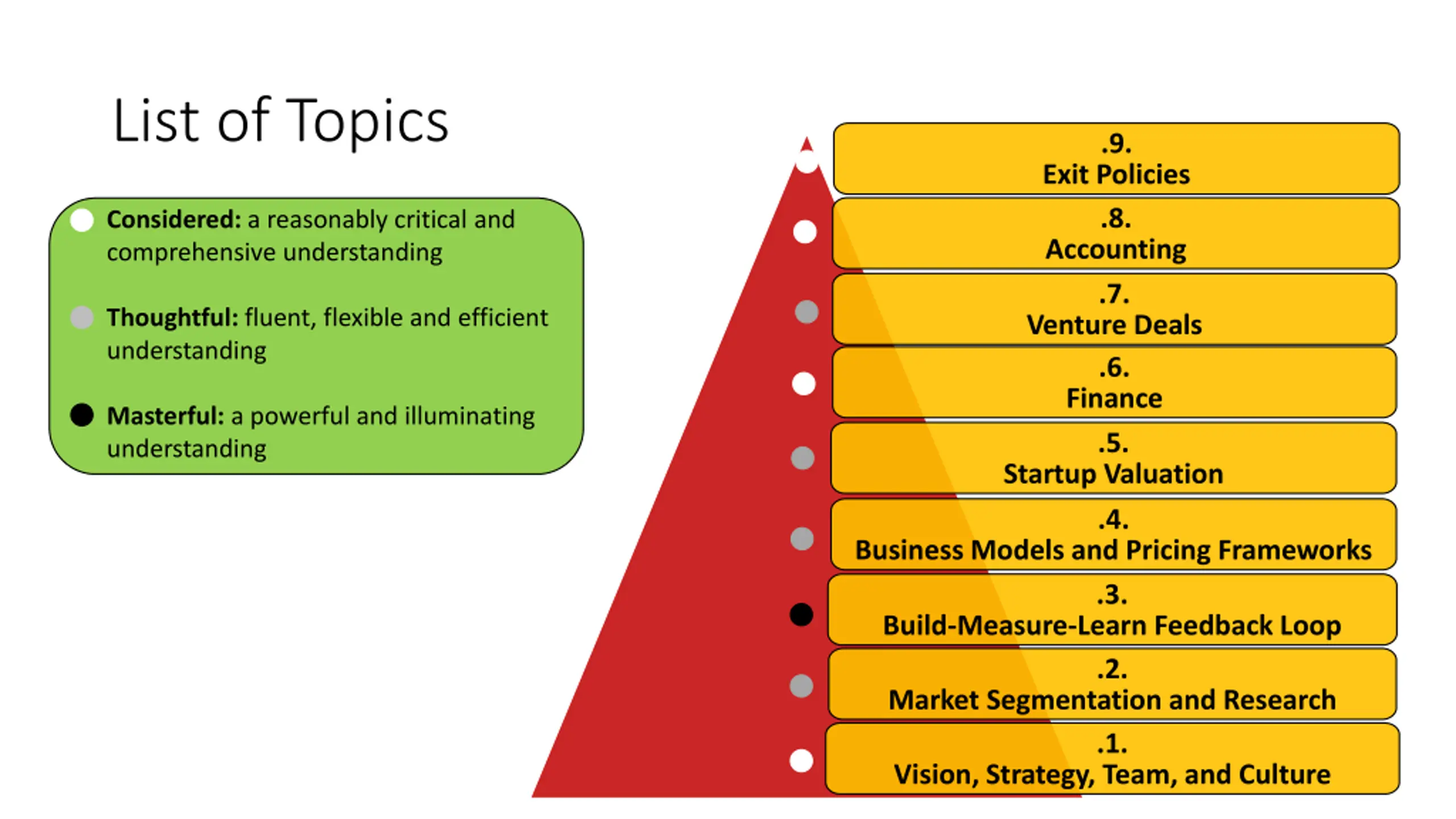 List of Topics .9. Exit Policies .8. Considered: a reasonably critical and comprehensive understanding Accounting .7. Thoughtful: fluent, flexible and efficient understanding Venture Deals .6. Finance Masterful: a powerful and illuminating understanding .5. Startup Valuation .4. Business Models and Pricing Frameworks .3. Build-Measure-Learn Feedback Loop .2. Market Segmentation and Research .1. Vision, Strategy, Team, and Culture
