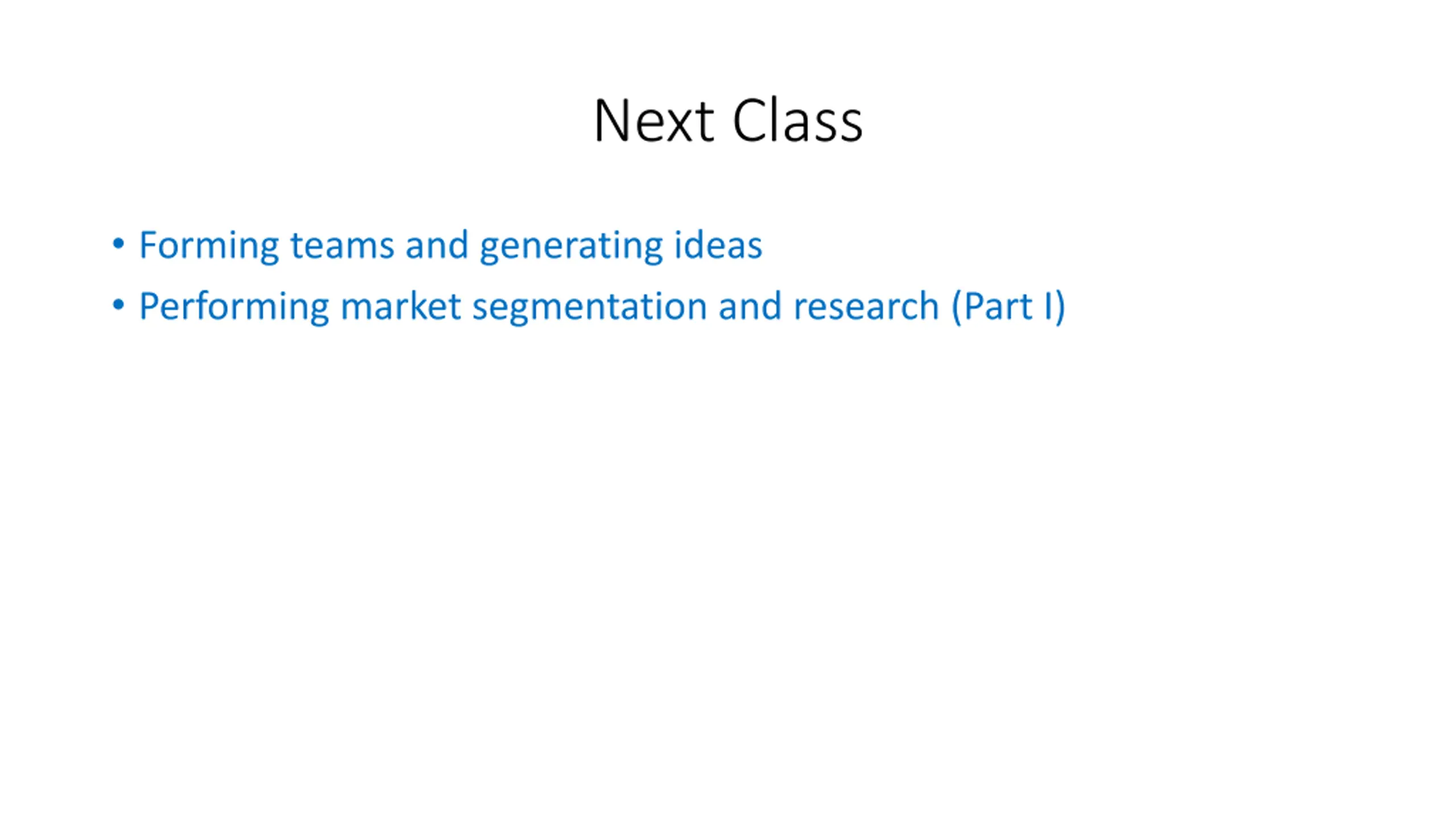 Next Class Forming teams and generating ideas Performing market segmentation and research (Part I)