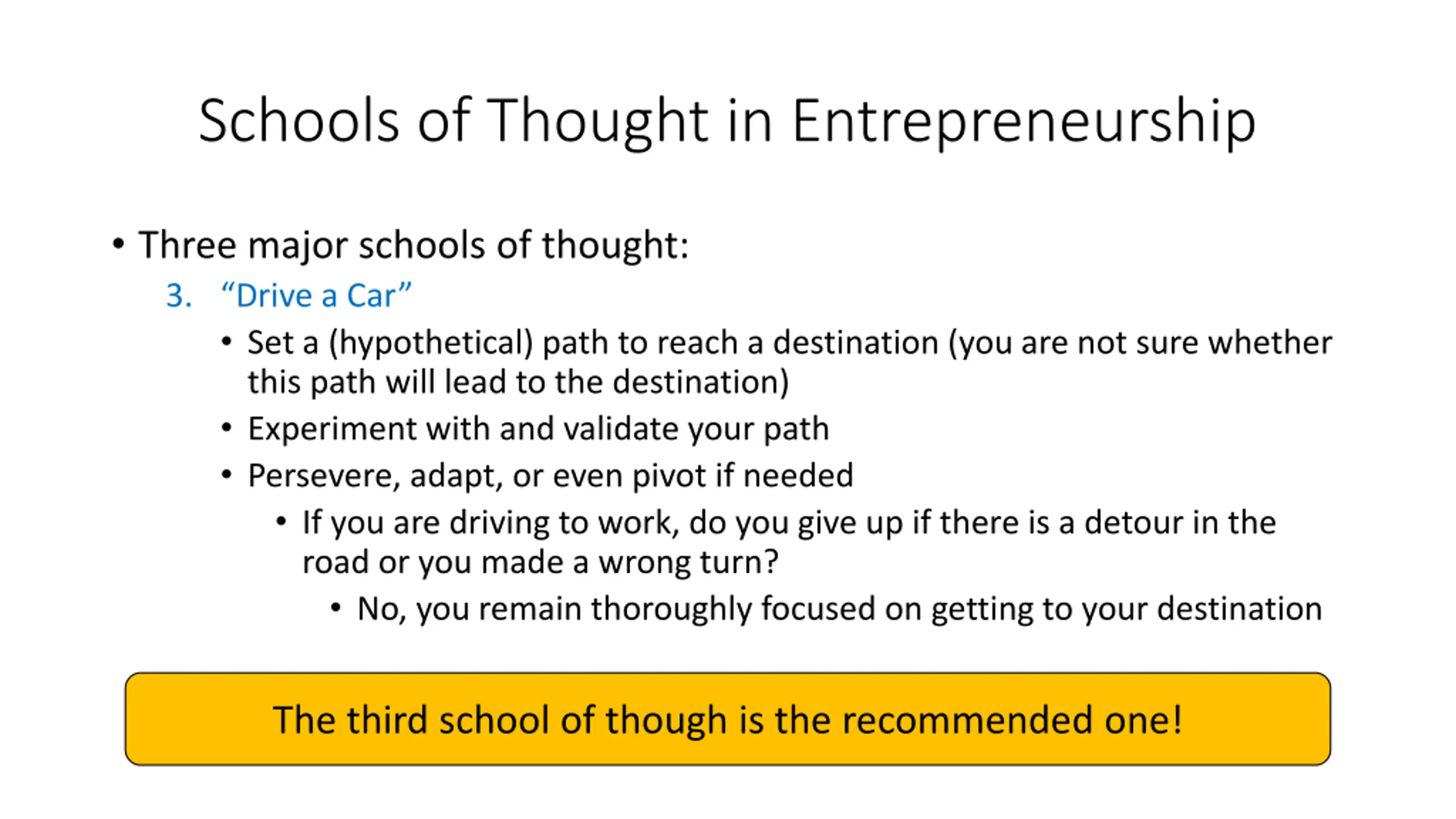 Schools of Thought in Entrepreneurship Three major schools of thought: 3. Drive a Car Set a (hypothetical) path to reach a destination (you are not sure whether this path will lead to the destination) Experiment with and validate your path Persevere, adapt, or even pivot if needed If you are driving to work, do you give up if there is a detour in the road or you made a wrong turn? No, you remain thoroughly focused on getting to your destination The third school of though is the recommended one!