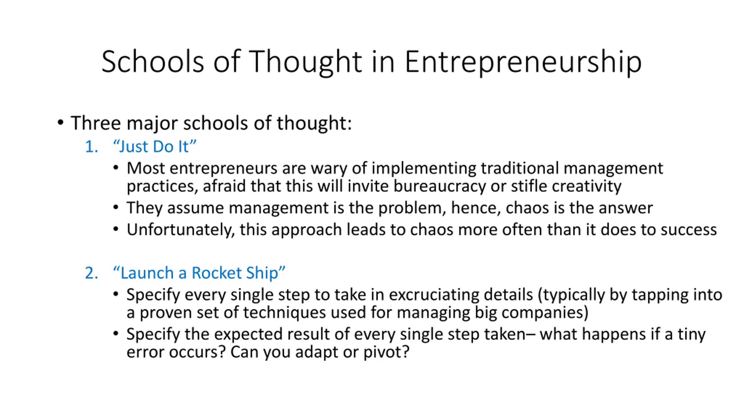 Schools of Thought in Entrepreneurship Three major schools of thought: 1. Just Do It Most entrepreneurs are wary of implementing traditional management practices, afraid that this will invite bureaucracy or stifle creativity They assume management is the problem, hence, chaos is the answer Unfortunately, this approach leads to chaos more often than it does to success 2. Launch a Rocket Ship Specify every single step to take in excruciating details (typically by tapping into a proven set of techniques used for managing big companies) Specify the expected result of every single step taken what happens if a tiny error occurs? Can you adapt or pivot?