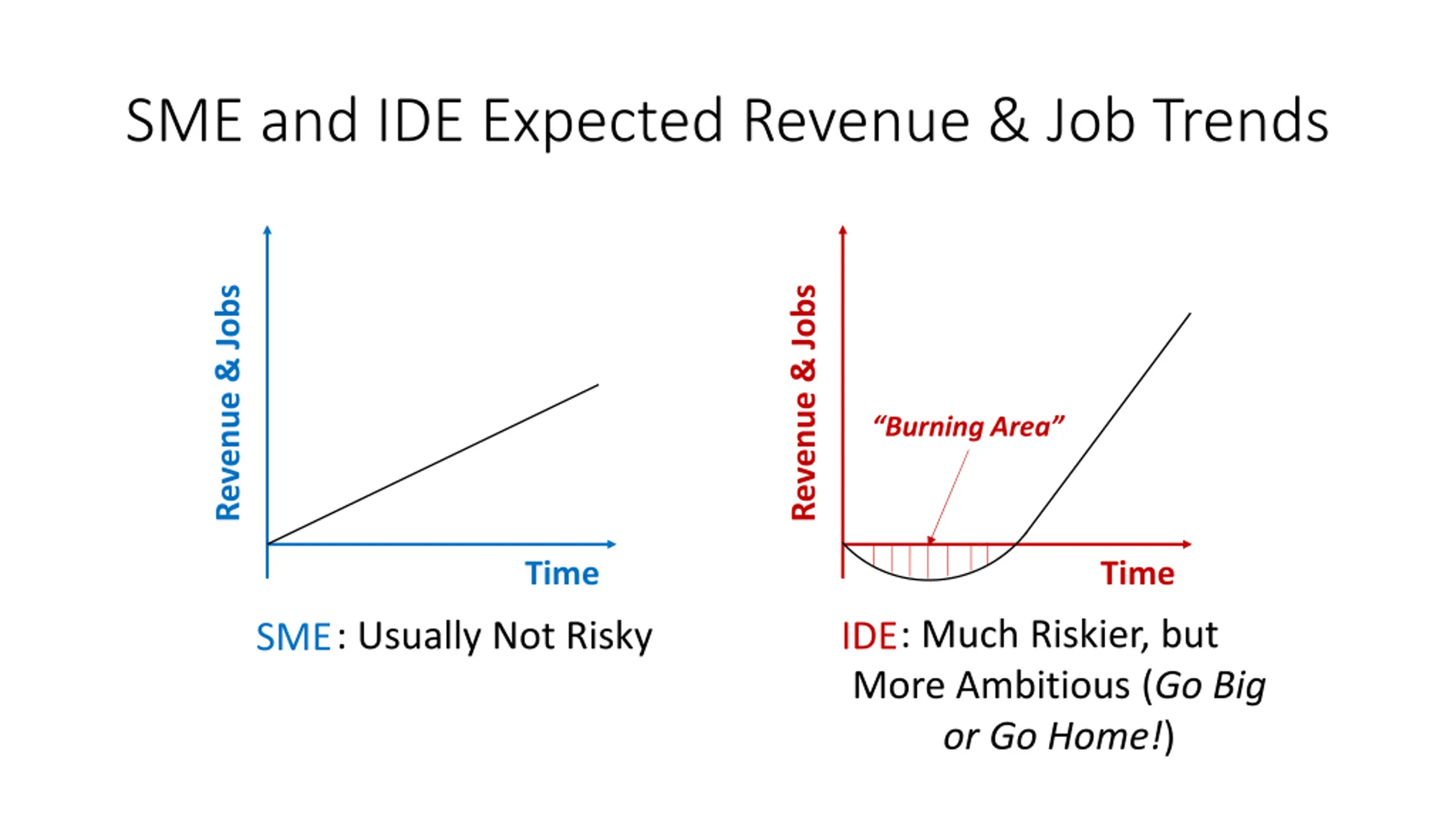SME and IDE Expected Revenue & Job Trends Revenue & Jobs Revenue & Jobs Burning Area Time Time : Much Riskier, but : Usually Not Risky IDE More Ambitious (Go Big or Go Home!) SME